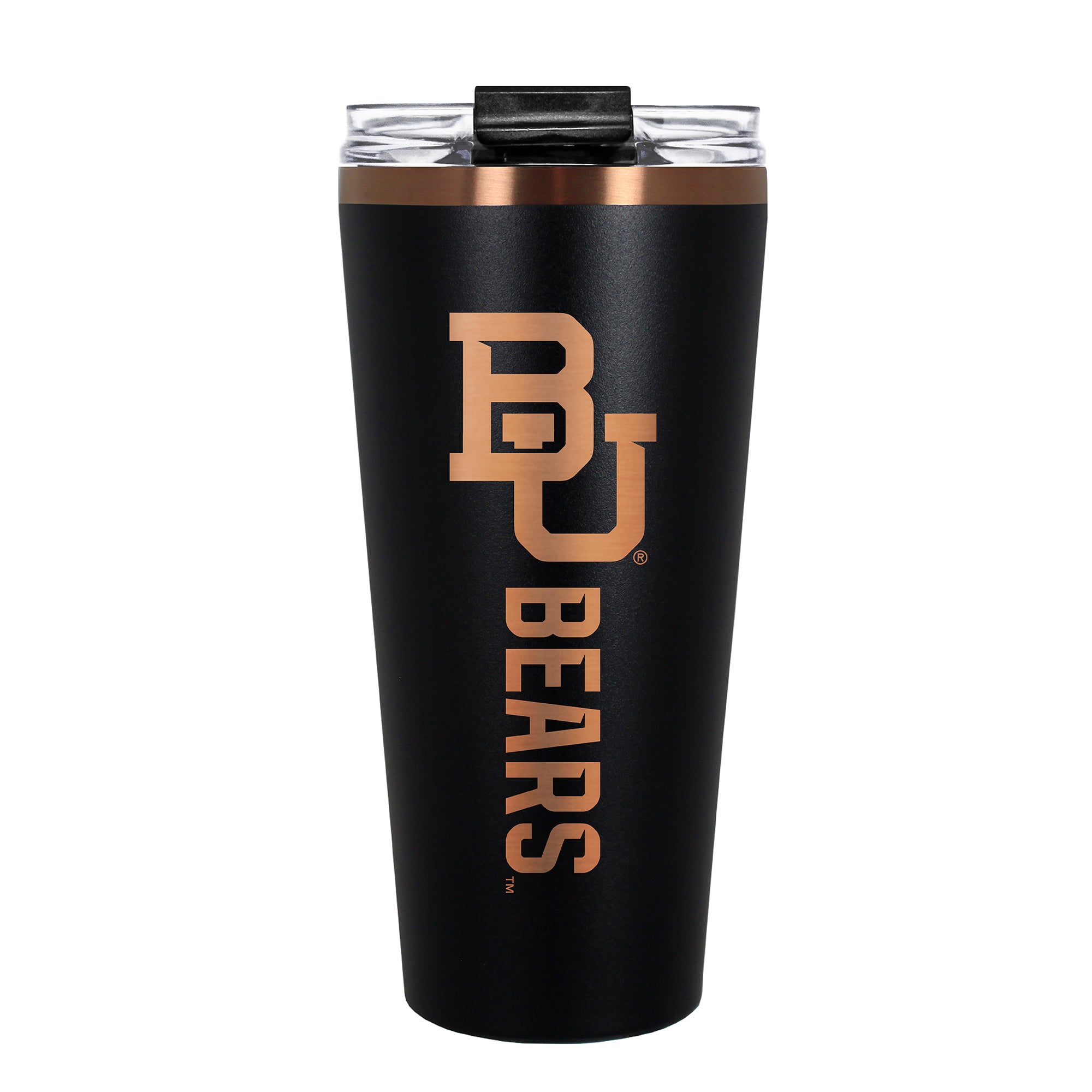 The 30 oz. BIG SLIM tumbler is made of high quality vacuum insulated stainless steel featuring premium copper undertones with a durable powder coated black outer finish and laser etched team graphics. Includes a clear push down spill resistant lid and straw.