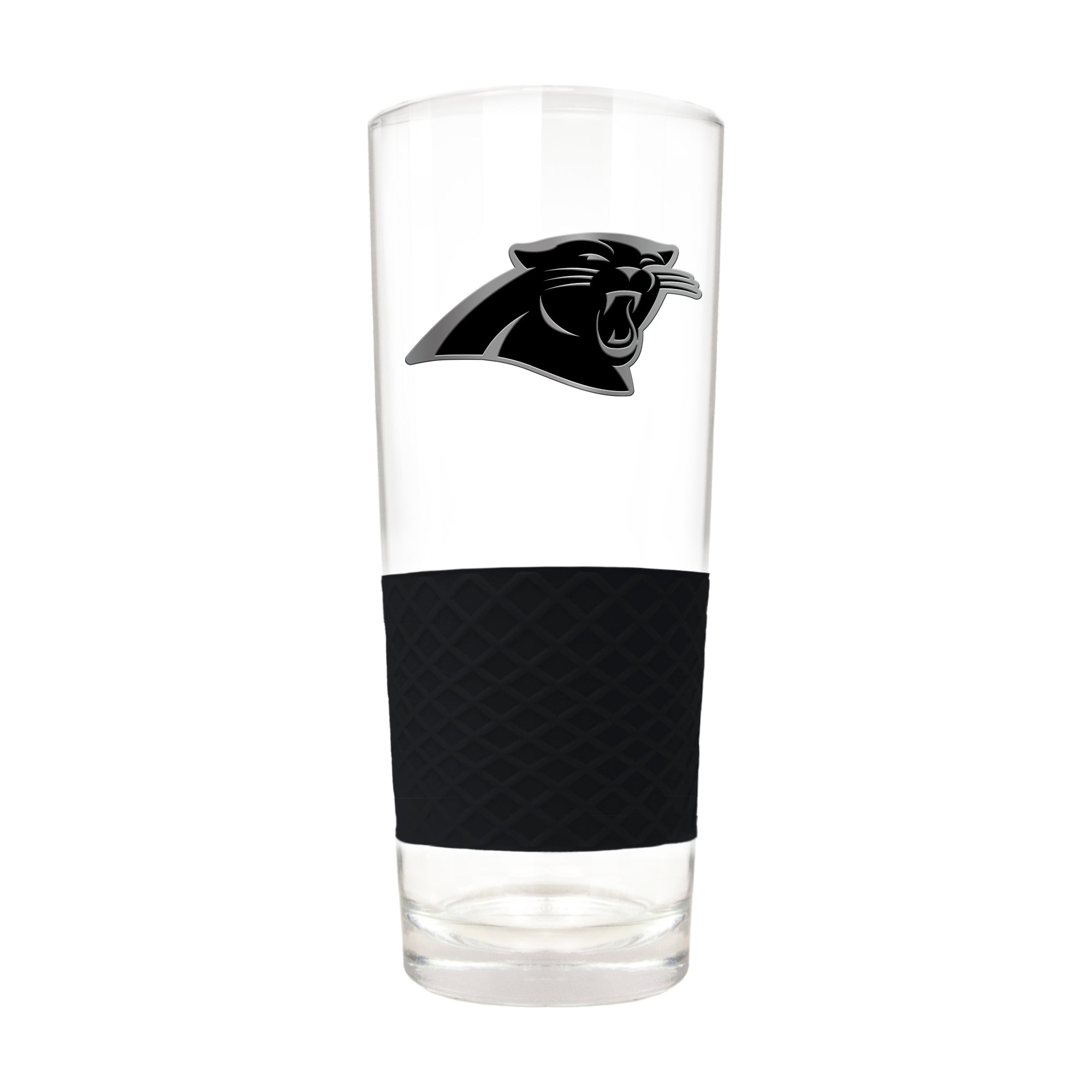 This 20 oz pint glass is decorated with a high-quality metal team logo and features a black silicone grip.