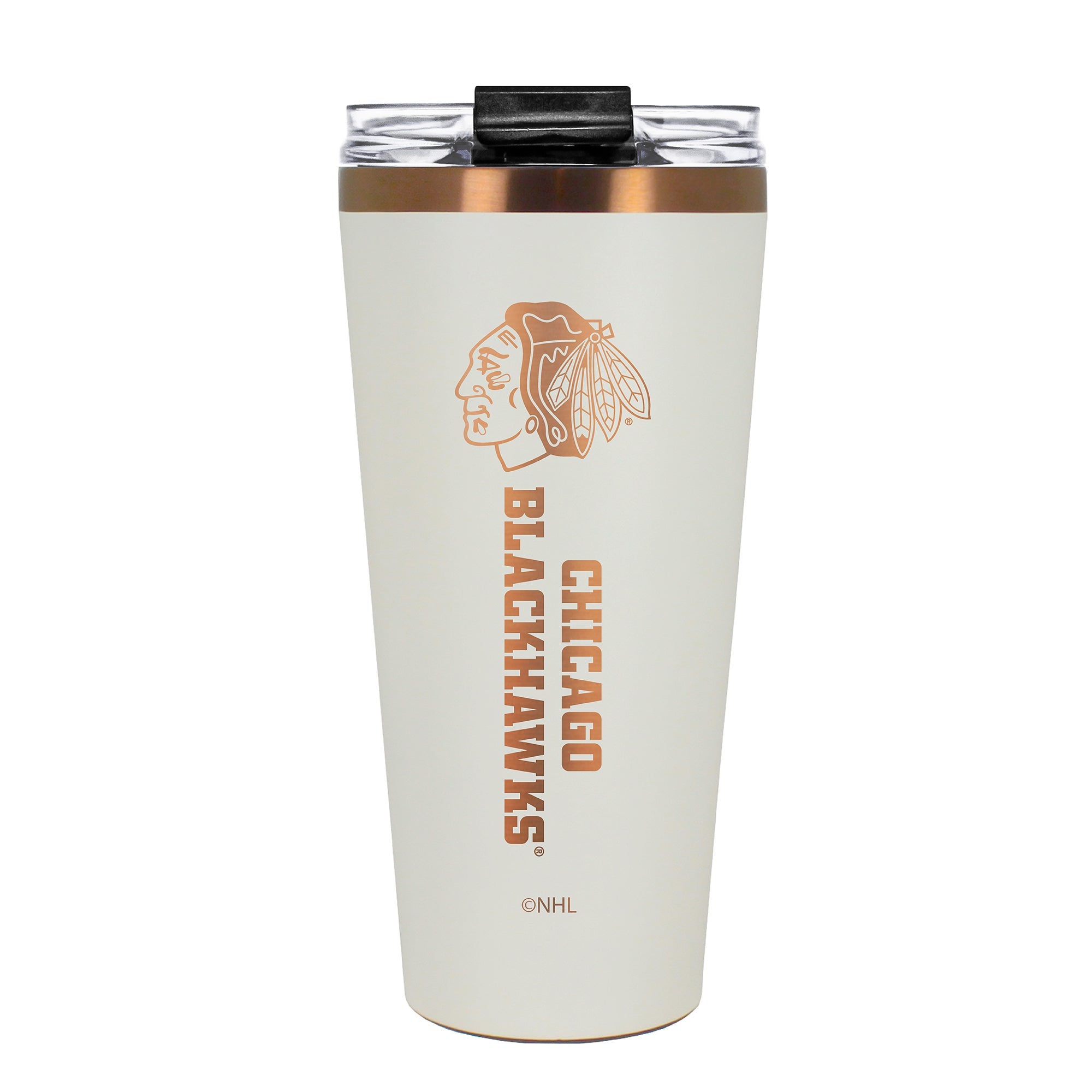 The 30 oz. BIG SLIM tumbler is made of high quality vacuum insulated stainless steel featuring premium copper undertones with a durable powder coated cream outer finish and laser etched team graphics. Includes a clear push down spill resistant lid and straw.