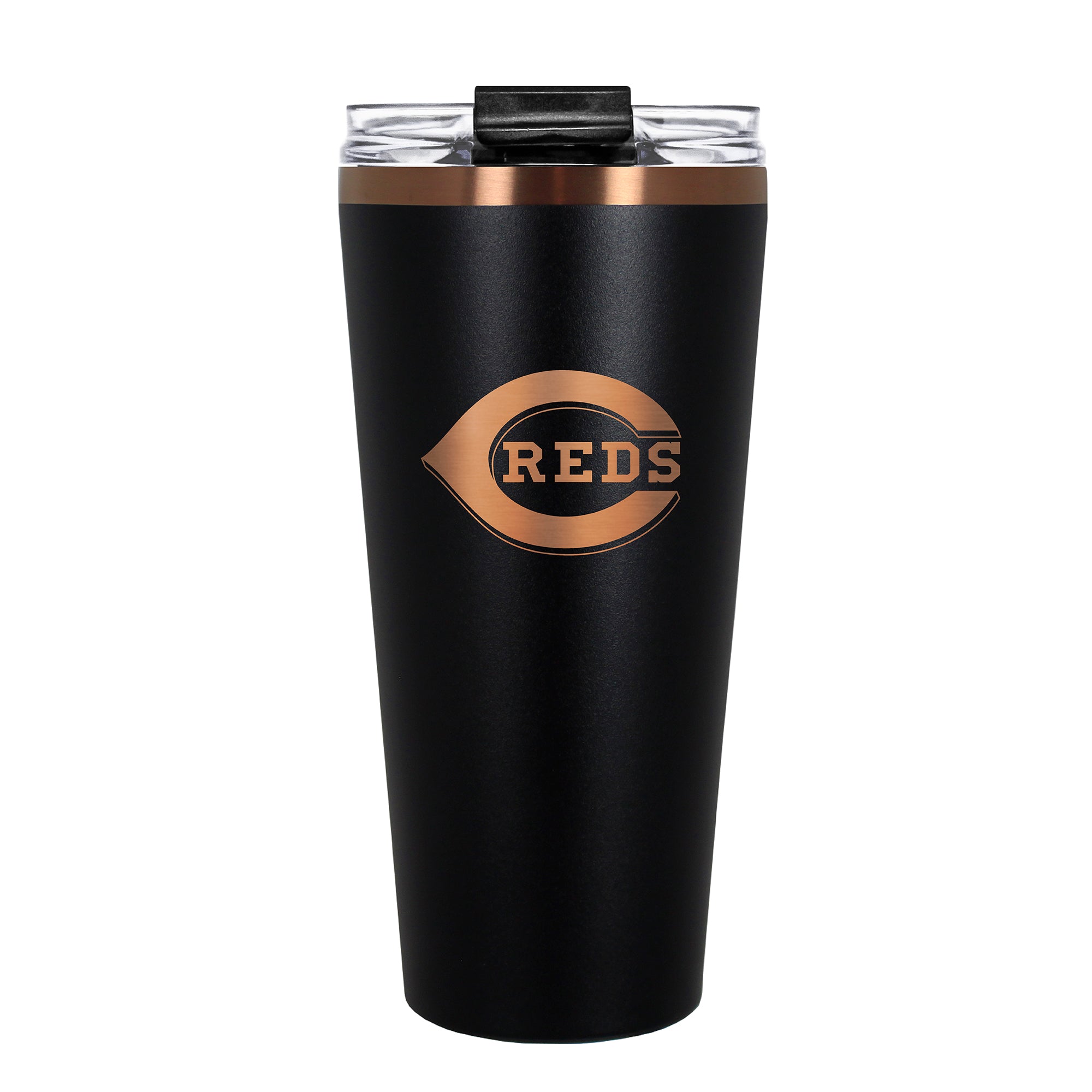 The 30 oz. BIG SLIM tumbler is made of high quality vacuum insulated stainless steel featuring premium copper undertones with a durable powder coated black outer finish and laser etched team graphics. Includes a clear push down spill resistant lid and straw.
