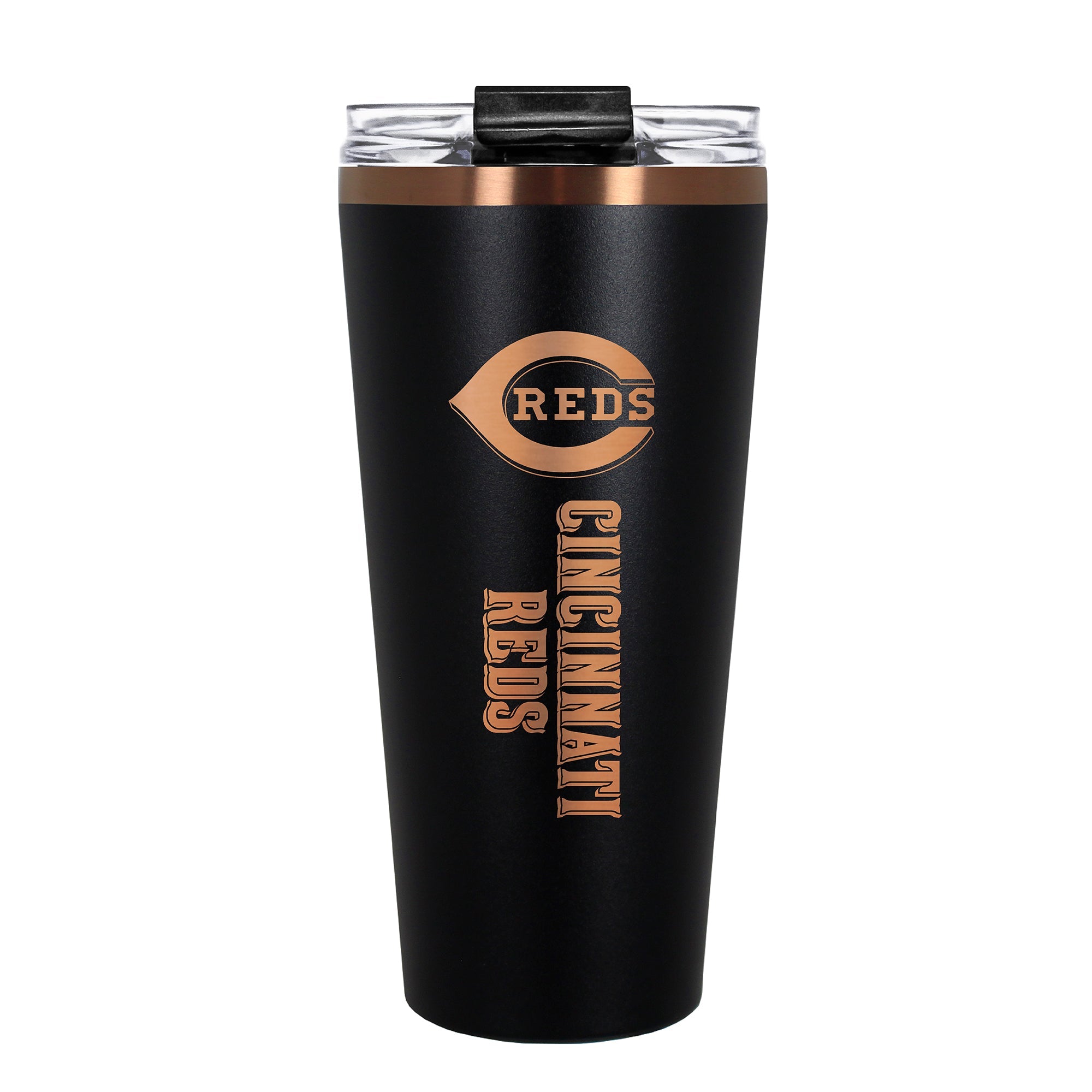 The 30 oz. BIG SLIM tumbler is made of high quality vacuum insulated stainless steel featuring premium copper undertones with a durable powder coated black outer finish and laser etched team graphics. Includes a clear push down spill resistant lid and straw.
