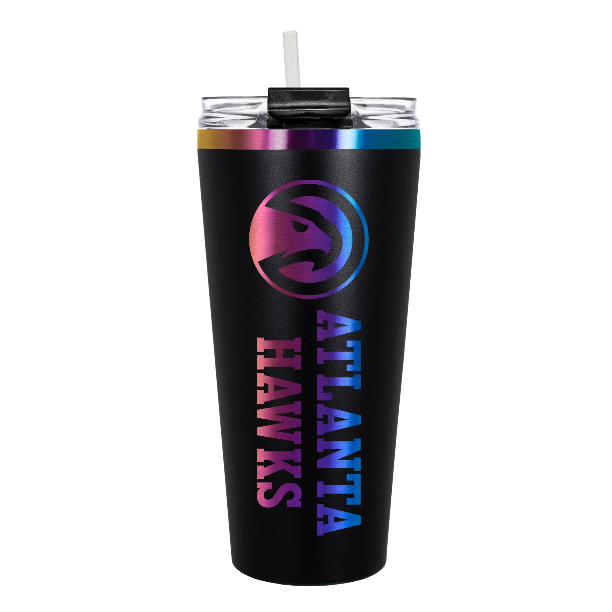 The 32 oz. BIG SLIM tumbler is made of high quality vacuum insulated stainless steel featuring premium multi-colorful radiance undertones with a durable powder coated black outer finish and laser etched team graphics. Includes a clear push down spill resistant lid and straw.