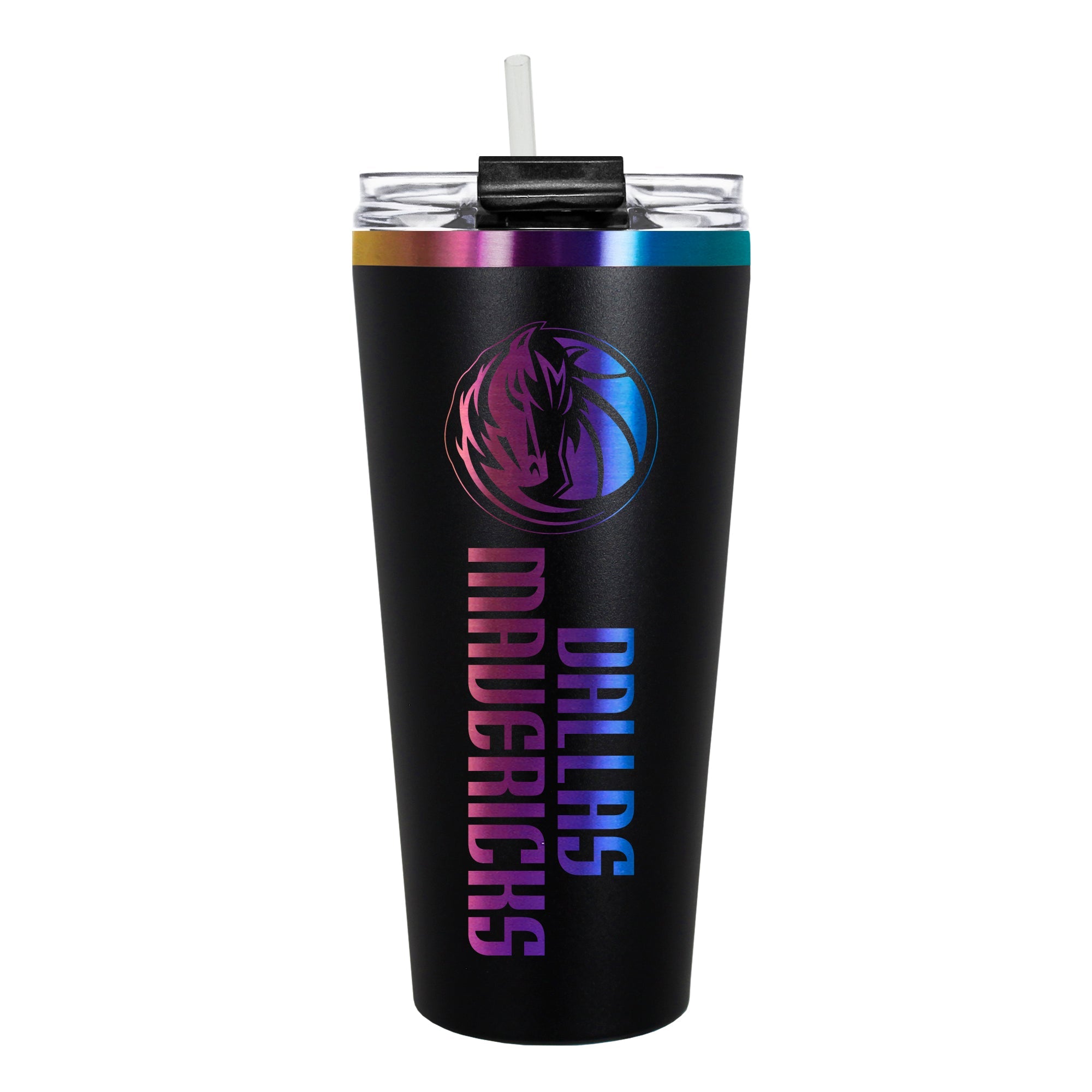 The 32 oz. BIG SLIM tumbler is made of high quality vacuum insulated stainless steel featuring premium multi-colorful radiance undertones with a durable powder coated black outer finish and laser etched team graphics. Includes a clear push down spill resistant lid and straw.