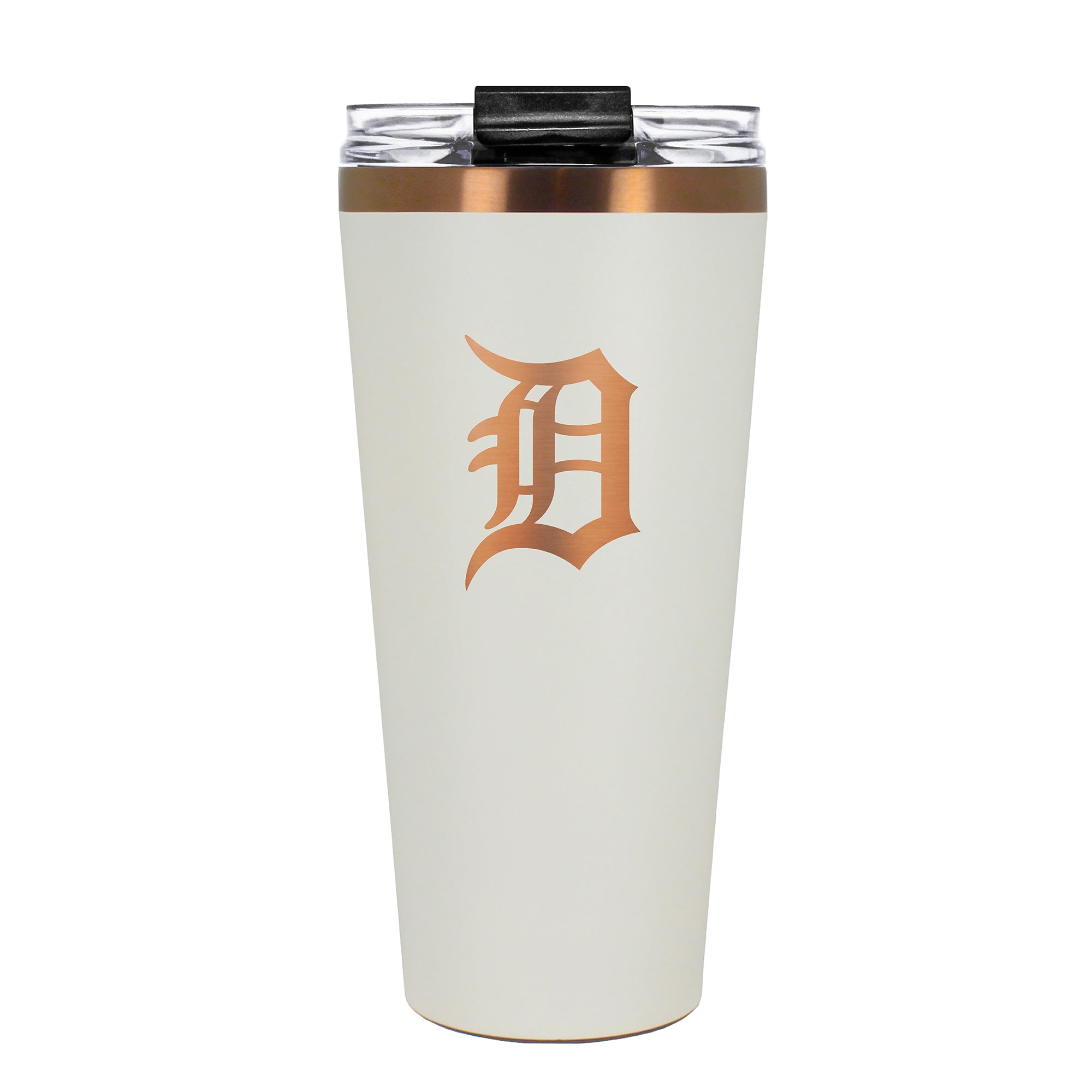 The 30 oz. BIG SLIM tumbler is made of high quality vacuum insulated stainless steel featuring premium copper undertones with a durable powder coated cream outer finish and laser etched team graphics. Includes a clear push down spill resistant lid and straw.