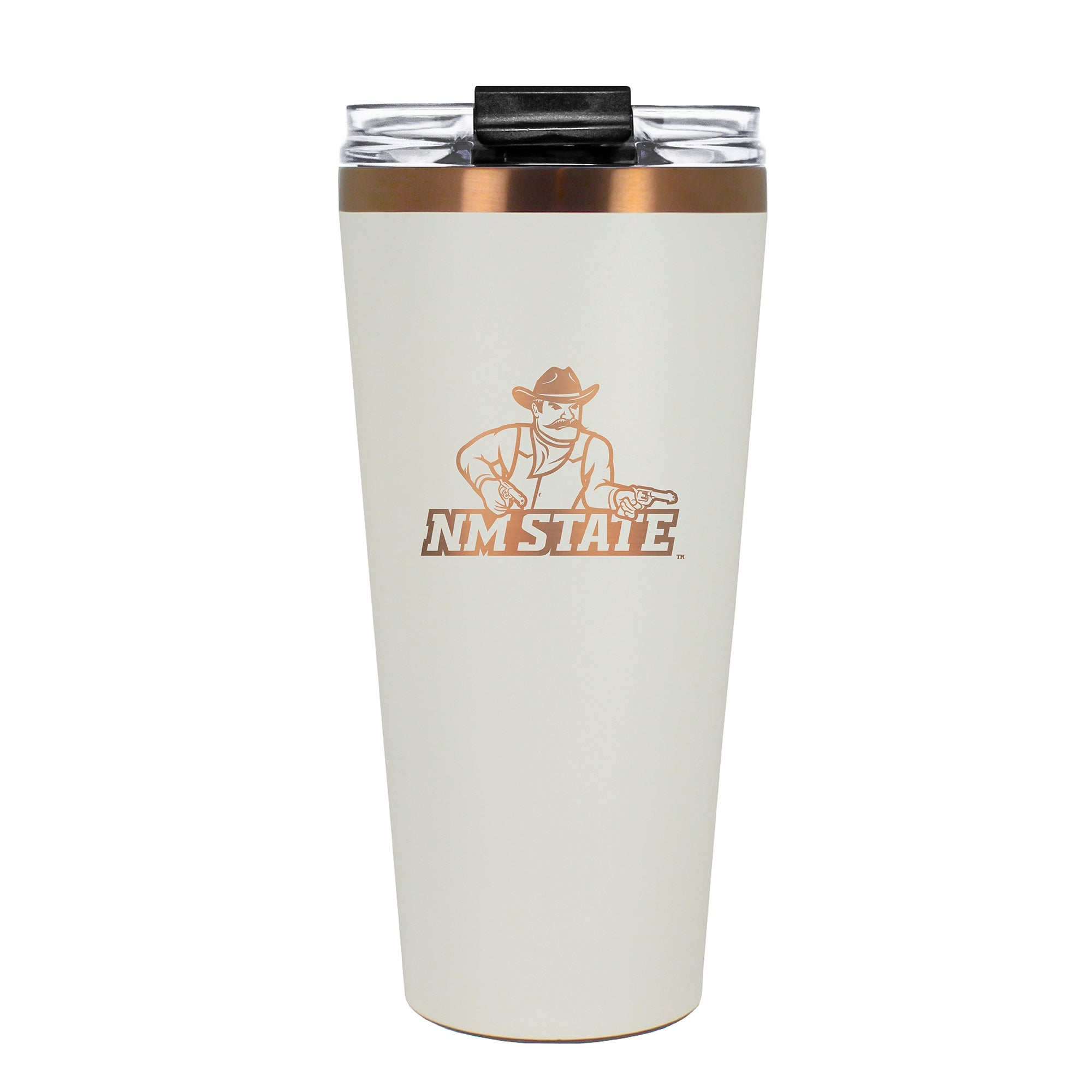 The 30 oz. BIG SLIM tumbler is made of high quality vacuum insulated stainless steel featuring premium copper undertones with a durable powder coated cream outer finish and laser etched team graphics. Includes a clear push down spill resistant lid and straw.