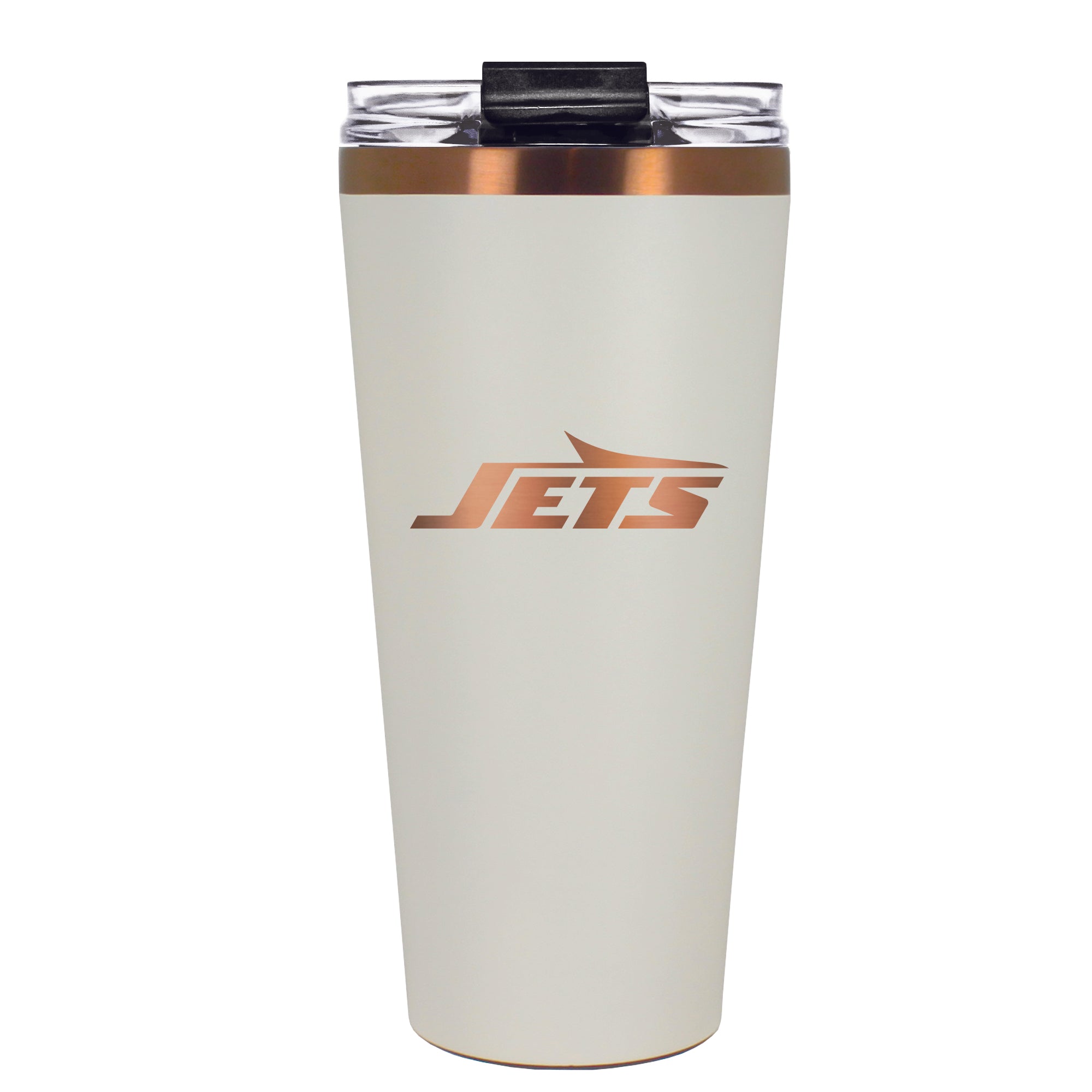 The 30 oz. BIG SLIM tumbler is made of high quality vacuum insulated stainless steel featuring premium copper undertones with a durable powder coated cream outer finish and laser etched team graphics. Includes a clear push down spill resistant lid and straw.