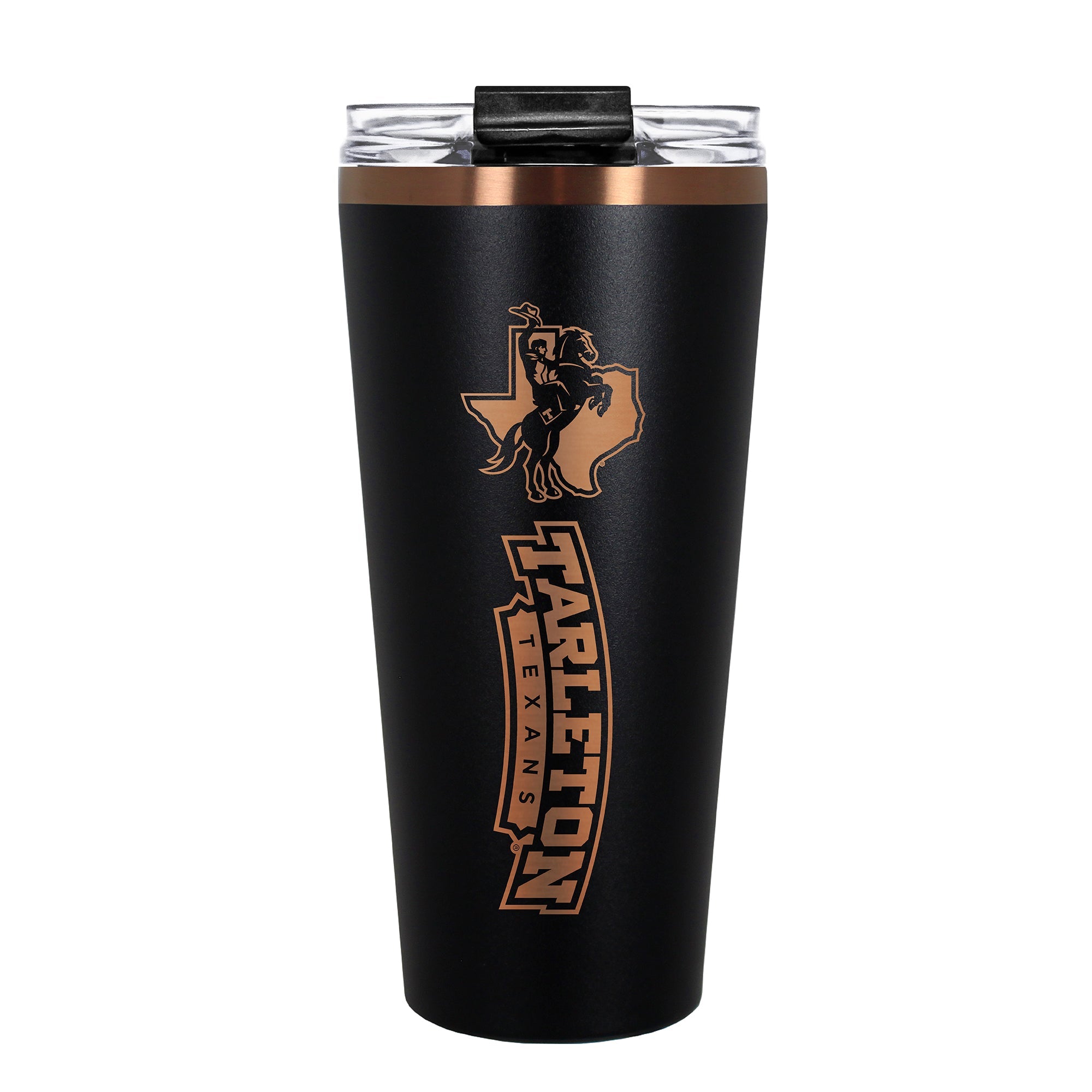 The 30 oz. BIG SLIM tumbler is made of high quality vacuum insulated stainless steel featuring premium copper undertones with a durable powder coated black outer finish and laser etched team graphics. Includes a clear push down spill resistant lid and straw.