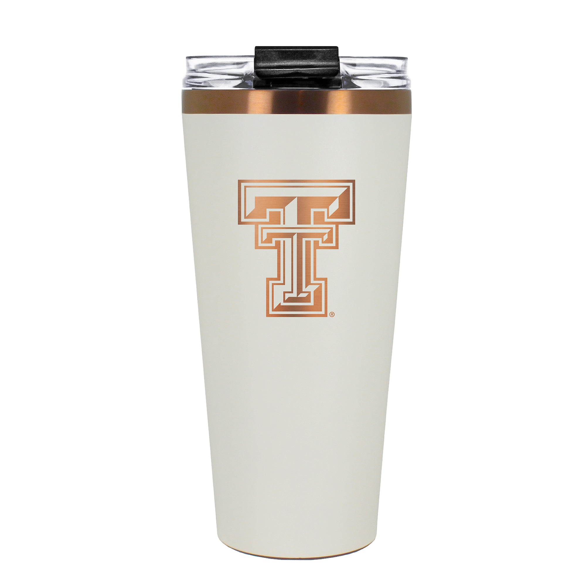 The 30 oz. BIG SLIM tumbler is made of high quality vacuum insulated stainless steel featuring premium copper undertones with a durable powder coated cream outer finish and laser etched team graphics. Includes a clear push down spill resistant lid and straw.
