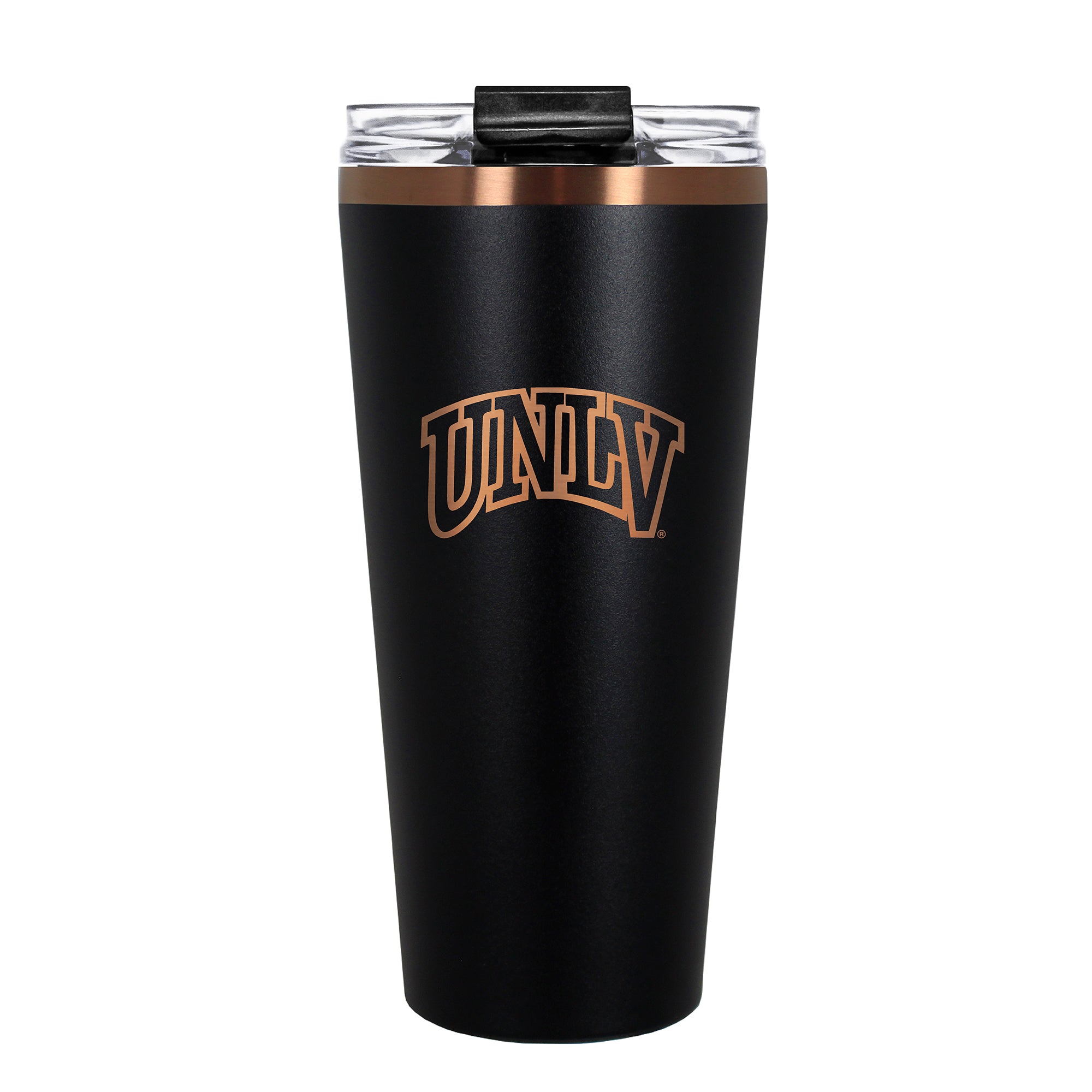 The 30 oz. BIG SLIM tumbler is made of high quality vacuum insulated stainless steel featuring premium copper undertones with a durable powder coated black outer finish and laser etched team graphics. Includes a clear push down spill resistant lid and straw.