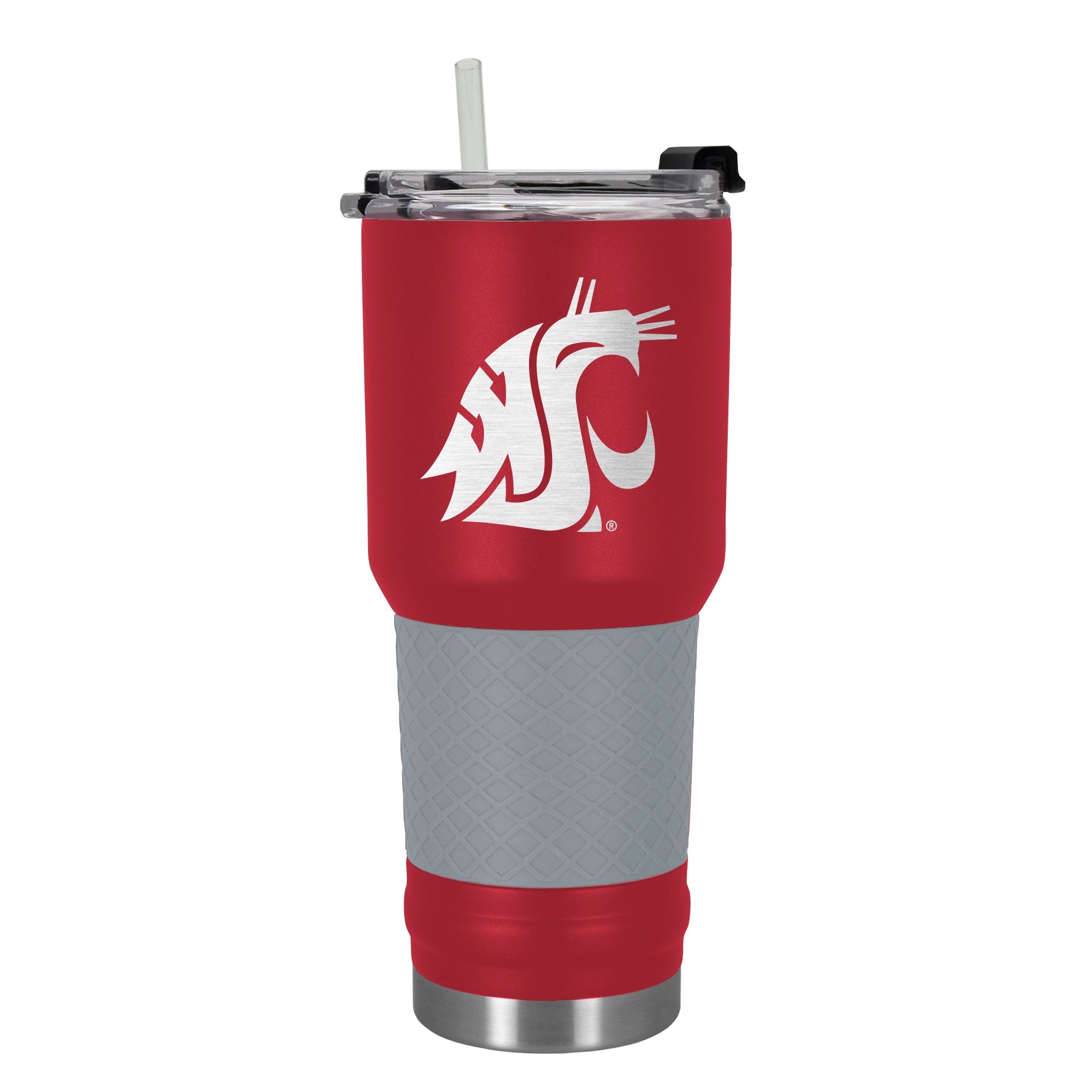 This 34 oz. DRAFT tumbler is vacuum insulated and made of high quality powder coated stainless steel. Features laser etched team graphics. Available in team color with coordinating silicone grip. Includes a clear push down spill resistant lid and straw.