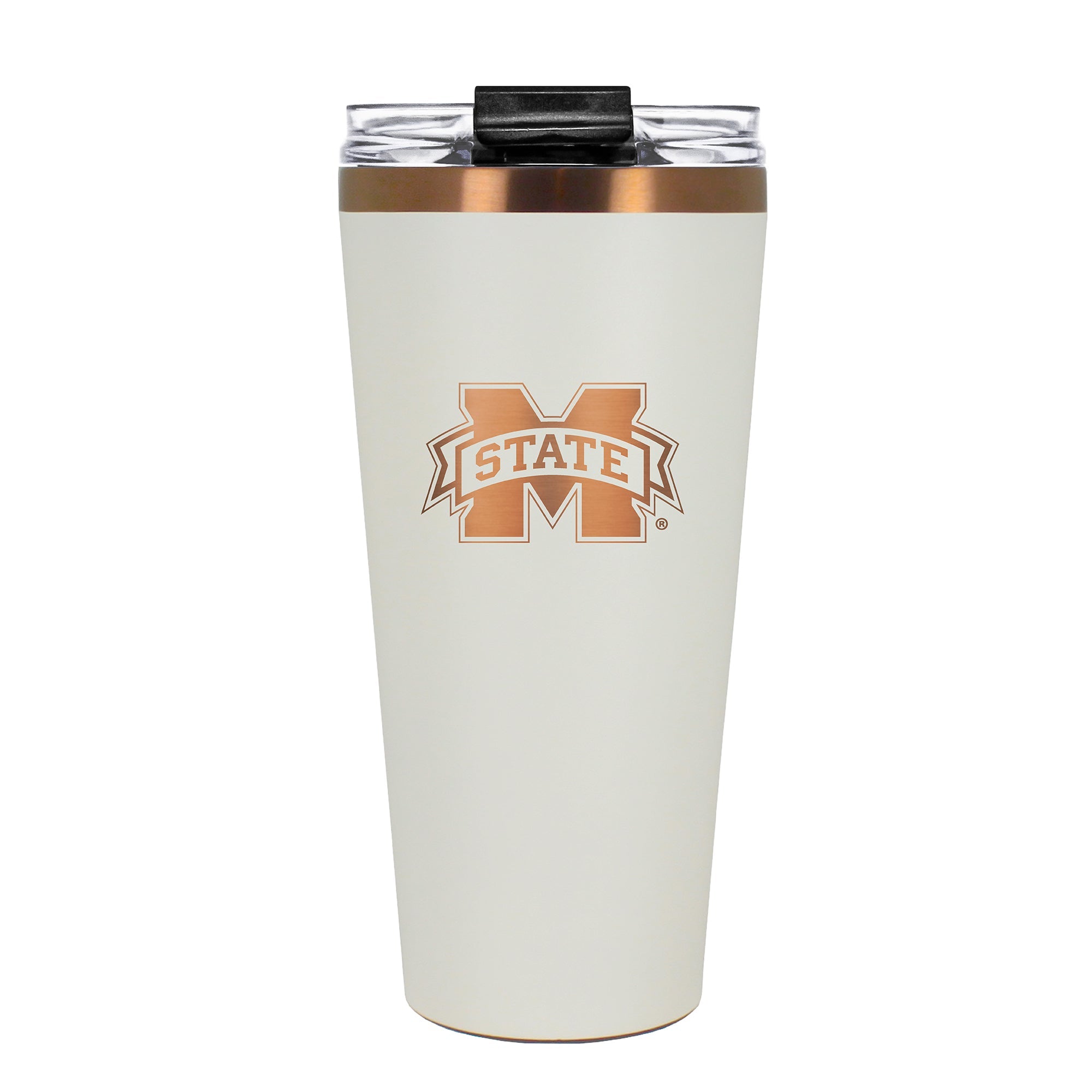 The 30 oz. BIG SLIM tumbler is made of high quality vacuum insulated stainless steel featuring premium copper undertones with a durable powder coated cream outer finish and laser etched team graphics. Includes a clear push down spill resistant lid and straw.
