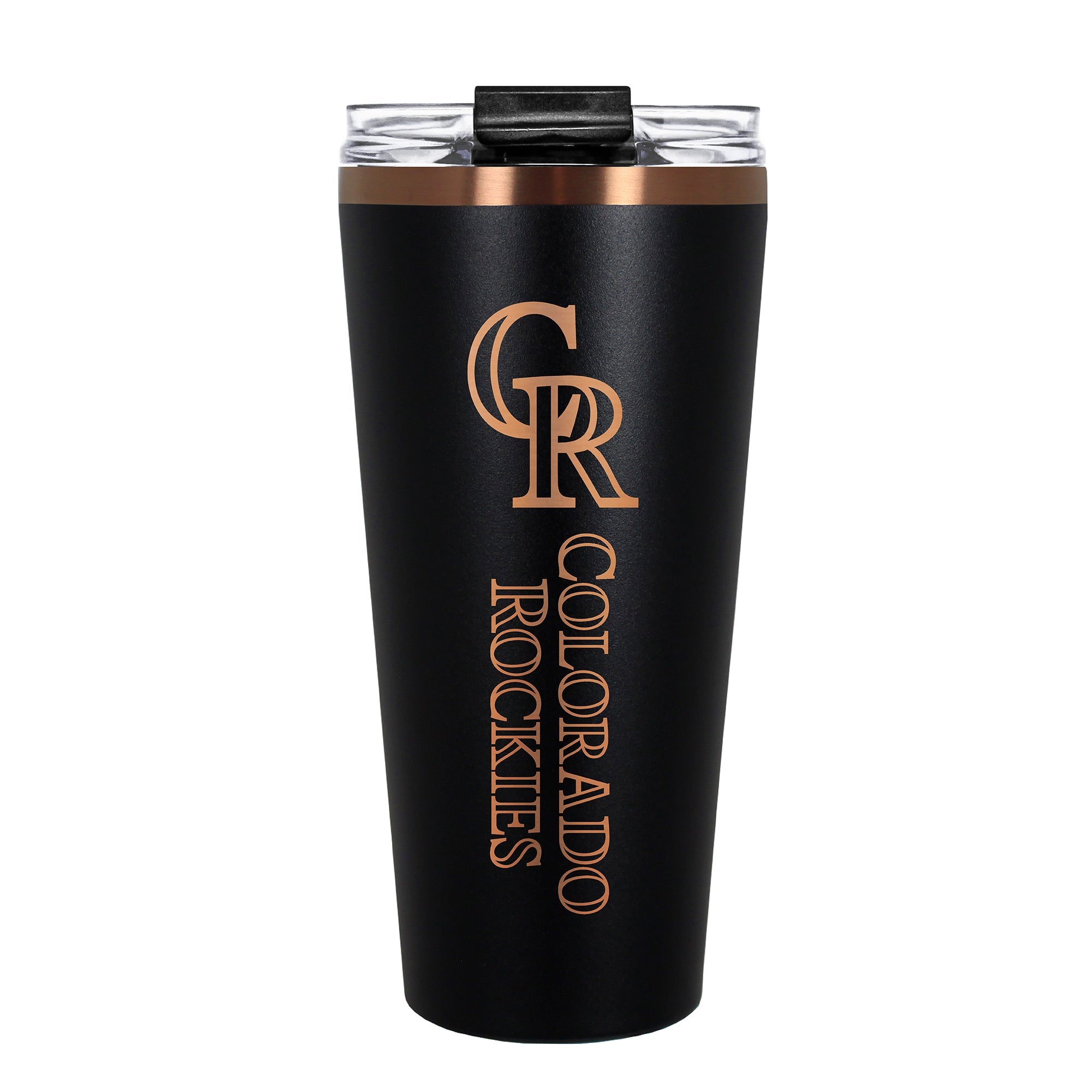 The 30 oz. BIG SLIM tumbler is made of high quality vacuum insulated stainless steel featuring premium copper undertones with a durable powder coated black outer finish and laser etched team graphics. Includes a clear push down spill resistant lid and straw.