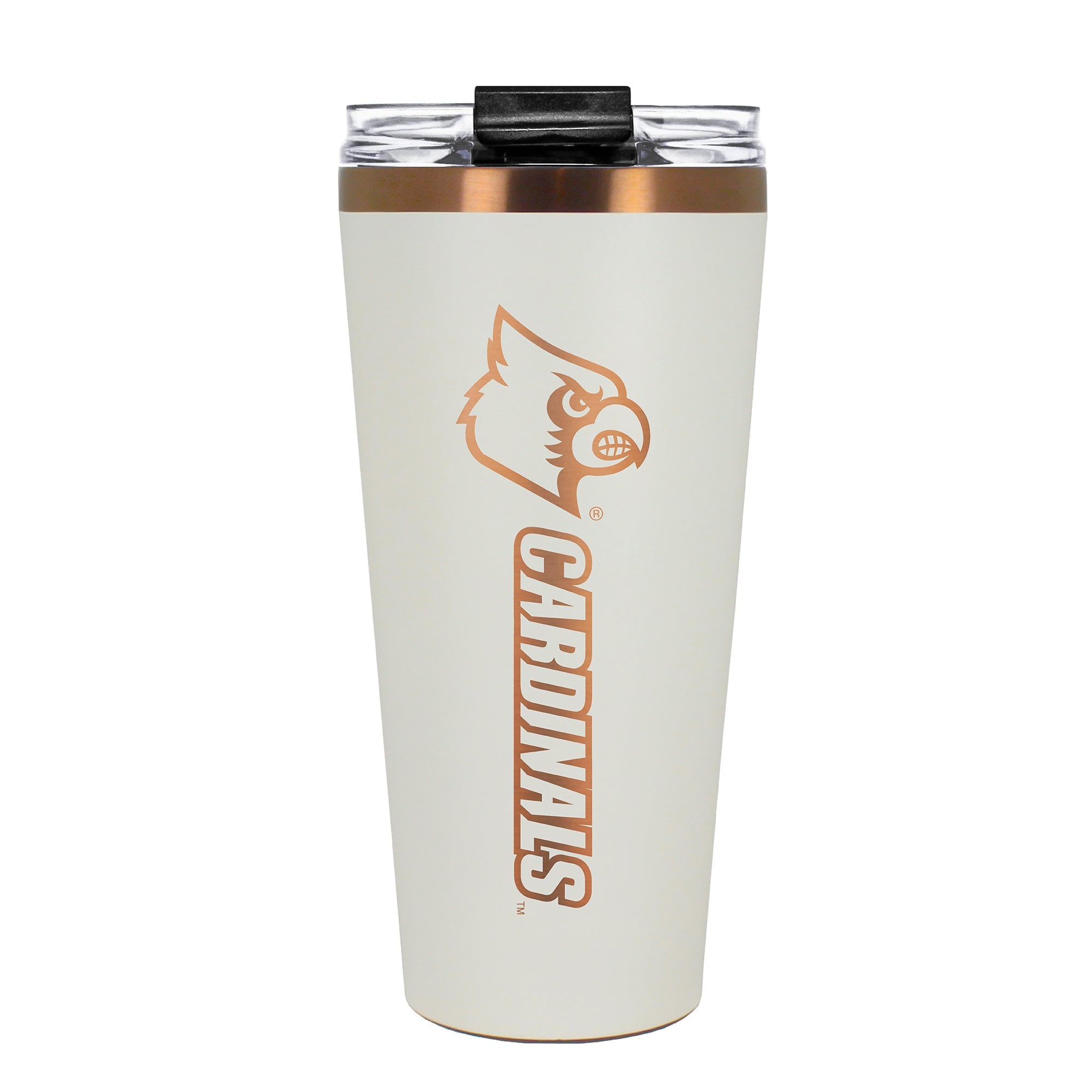 The 30 oz. BIG SLIM tumbler is made of high quality vacuum insulated stainless steel featuring premium copper undertones with a durable powder coated cream outer finish and laser etched team graphics. Includes a clear push down spill resistant lid and straw.