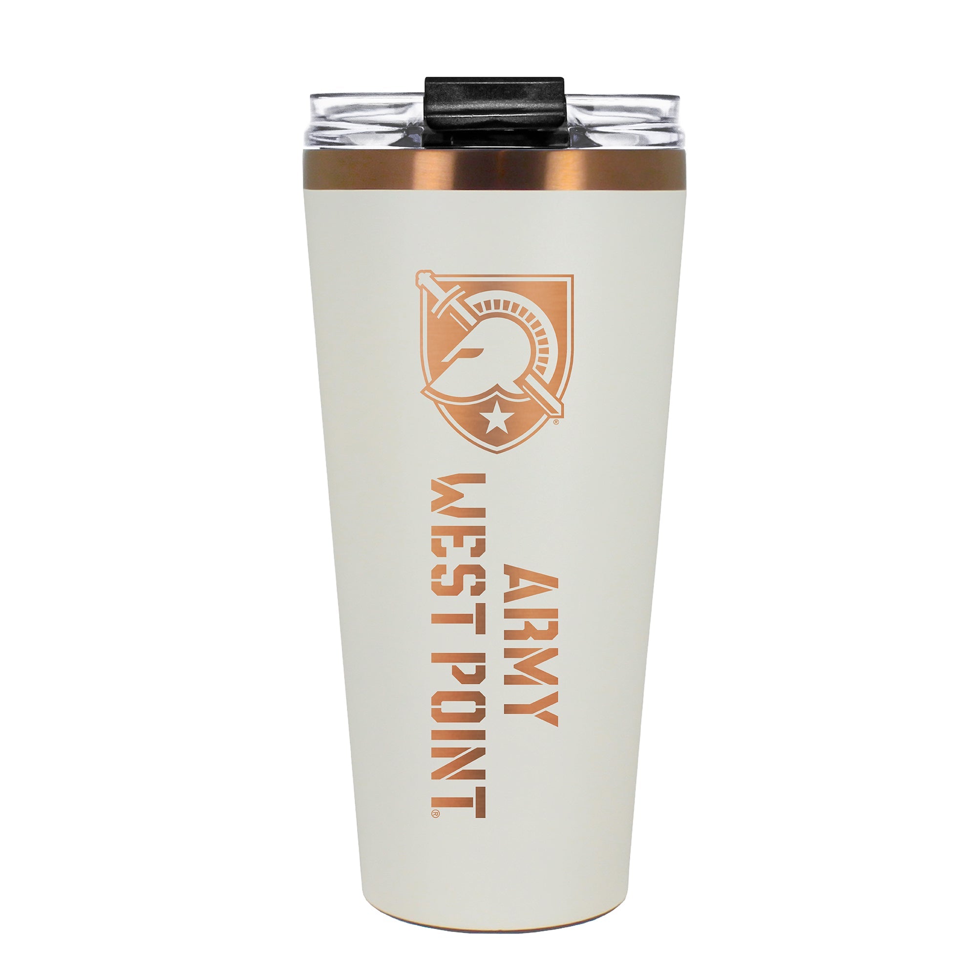 The 30 oz. BIG SLIM tumbler is made of high quality vacuum insulated stainless steel featuring premium copper undertones with a durable powder coated cream outer finish and laser etched team graphics. Includes a clear push down spill resistant lid and straw.