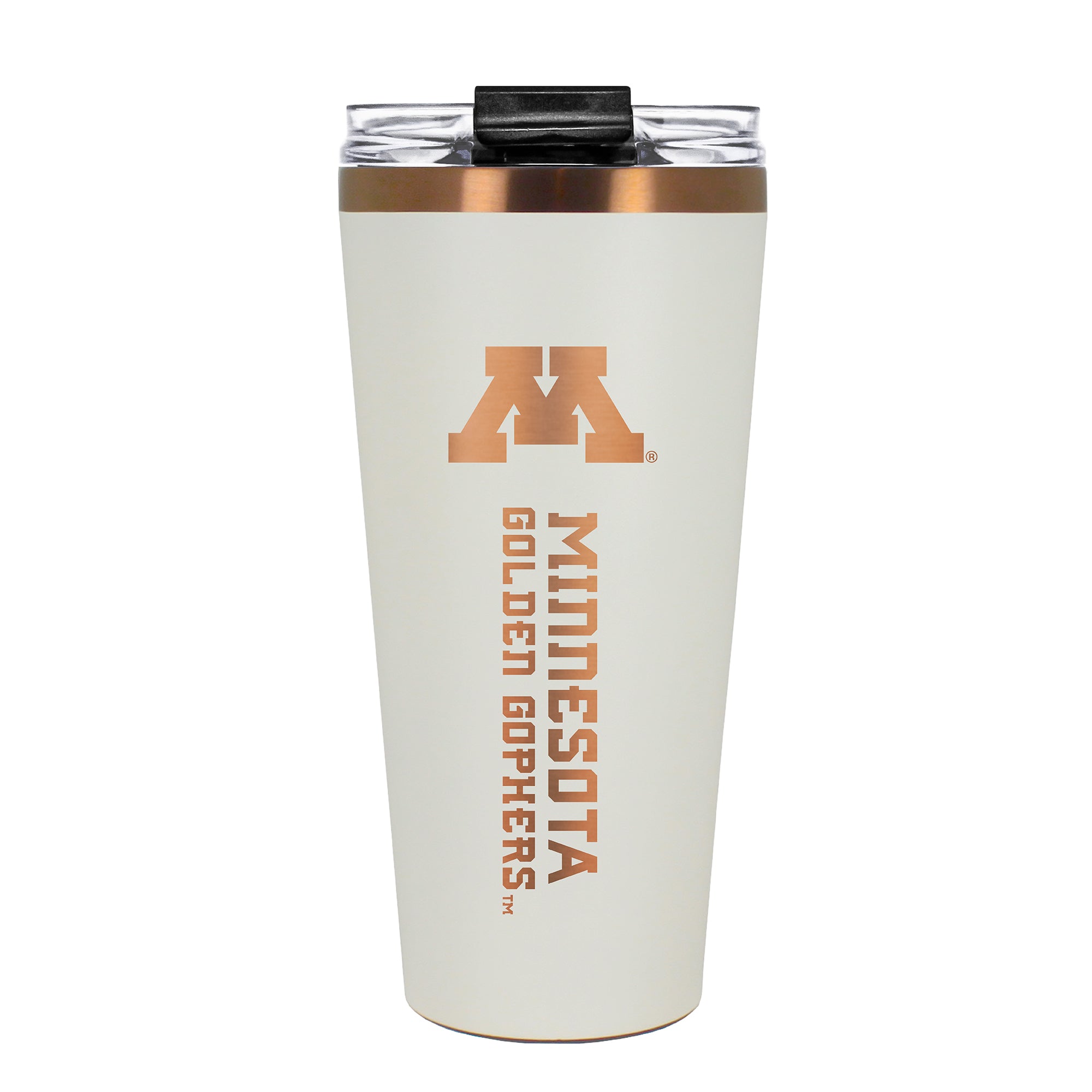 The 30 oz. BIG SLIM tumbler is made of high quality vacuum insulated stainless steel featuring premium copper undertones with a durable powder coated cream outer finish and laser etched team graphics. Includes a clear push down spill resistant lid and straw.