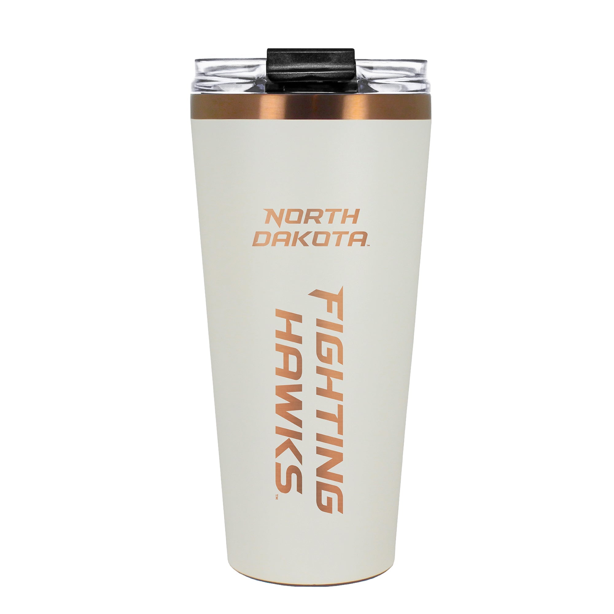The 30 oz. BIG SLIM tumbler is made of high quality vacuum insulated stainless steel featuring premium copper undertones with a durable powder coated cream outer finish and laser etched team graphics. Includes a clear push down spill resistant lid and straw.
