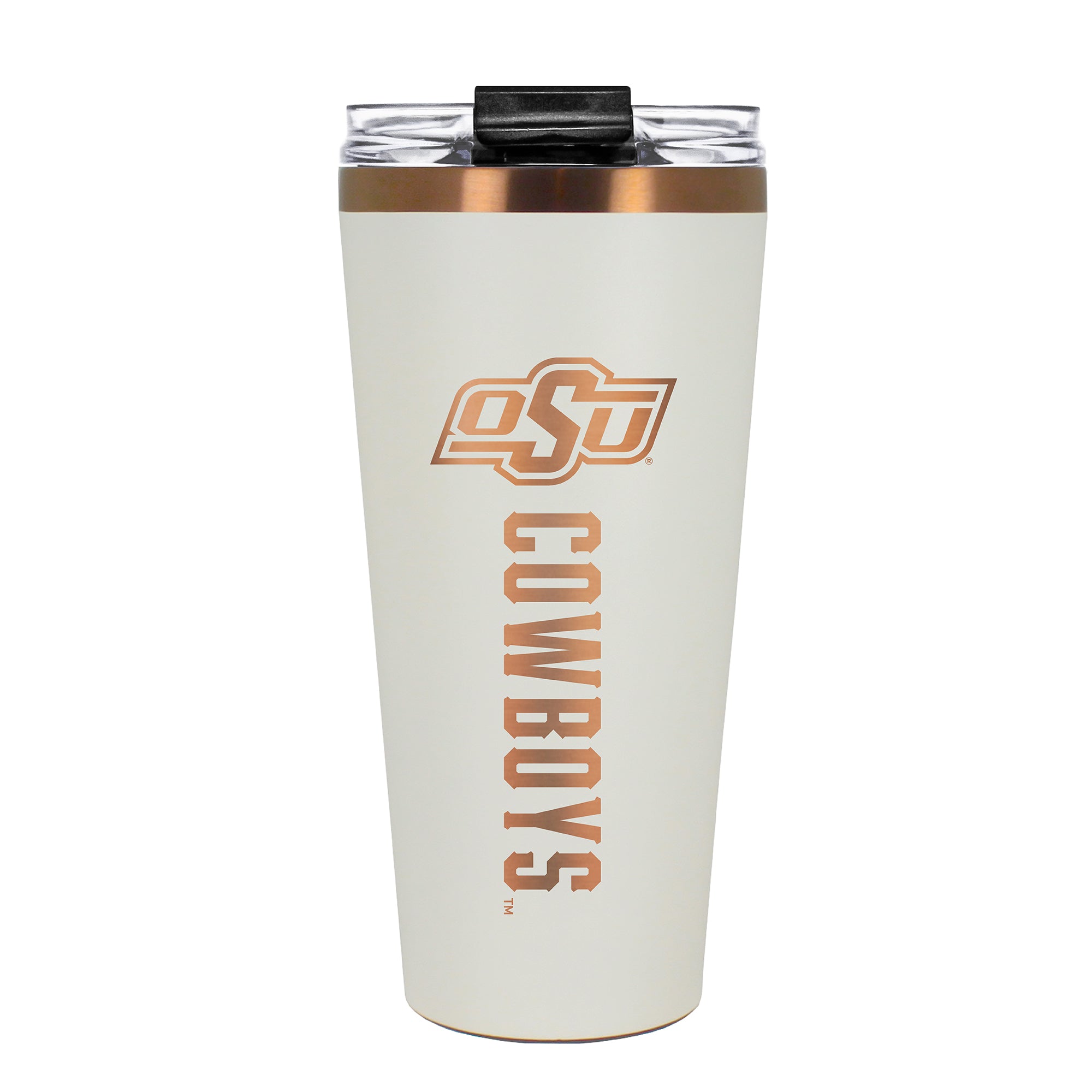 The 30 oz. BIG SLIM tumbler is made of high quality vacuum insulated stainless steel featuring premium copper undertones with a durable powder coated cream outer finish and laser etched team graphics. Includes a clear push down spill resistant lid and straw.