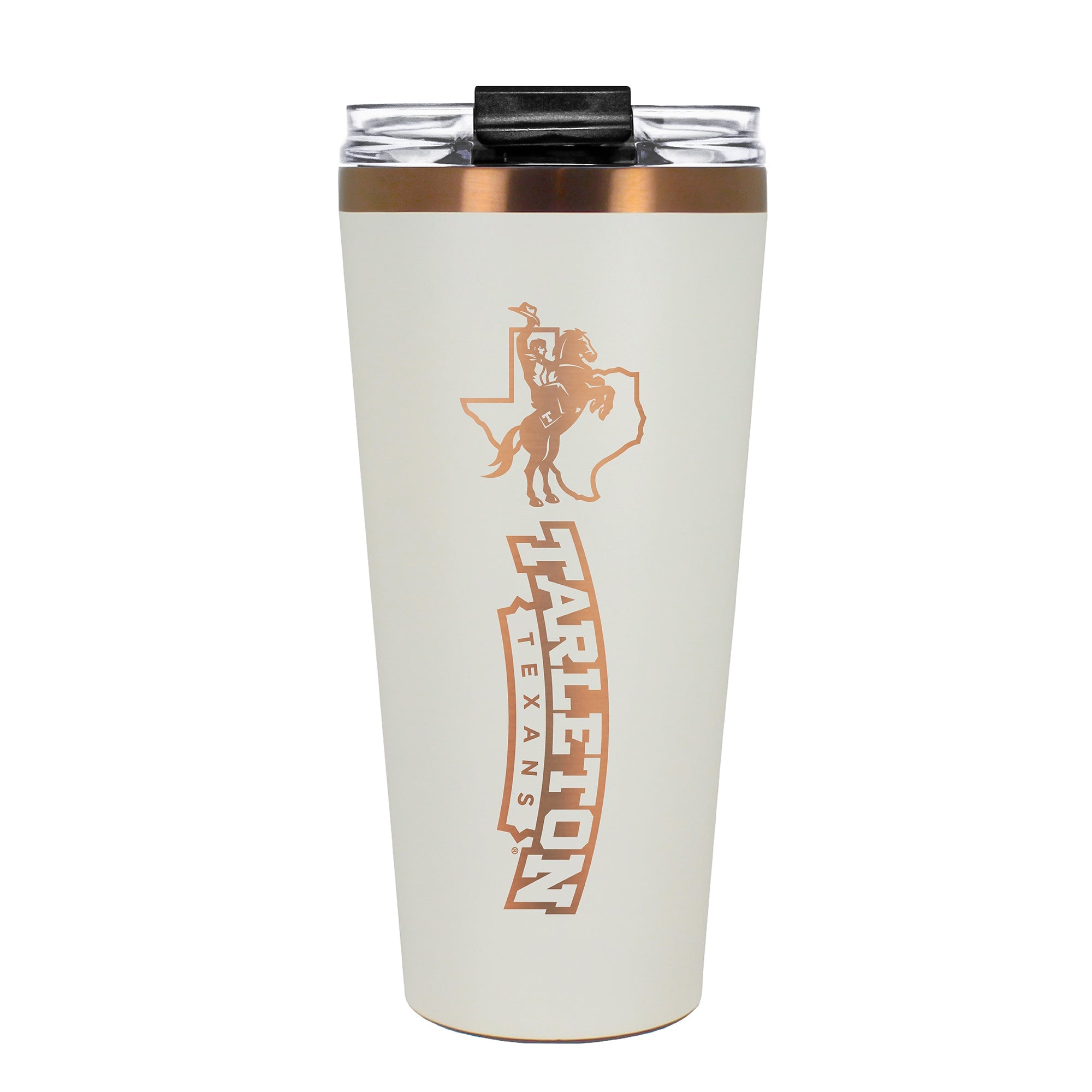 The 30 oz. BIG SLIM tumbler is made of high quality vacuum insulated stainless steel featuring premium copper undertones with a durable powder coated cream outer finish and laser etched team graphics. Includes a clear push down spill resistant lid and straw.
