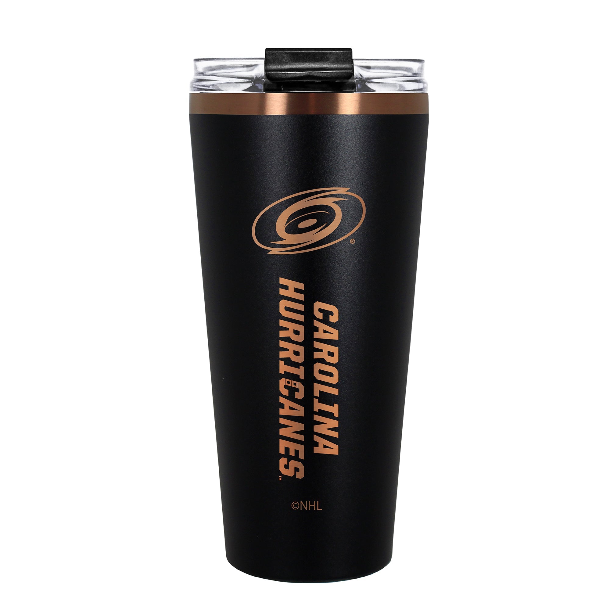 The 30 oz. BIG SLIM tumbler is made of high quality vacuum insulated stainless steel featuring premium copper undertones with a durable powder coated black outer finish and laser etched team graphics. Includes a clear push down spill resistant lid and straw.