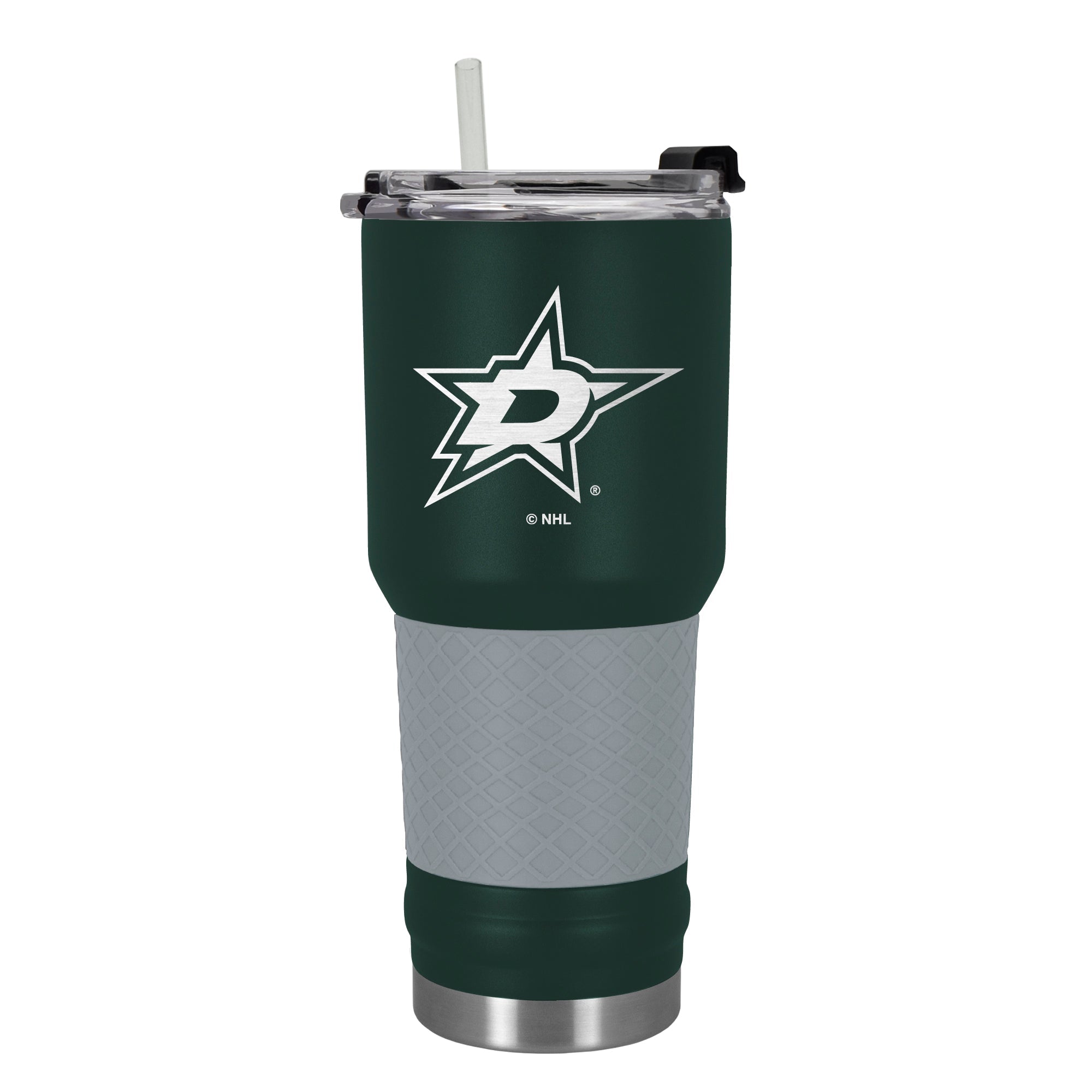 This 34 oz. DRAFT tumbler is vacuum insulated and made of high quality powder coated stainless steel. Features laser etched team graphics. Available in team color with coordinating silicone grip. Includes a clear push down spill resistant lid and straw.