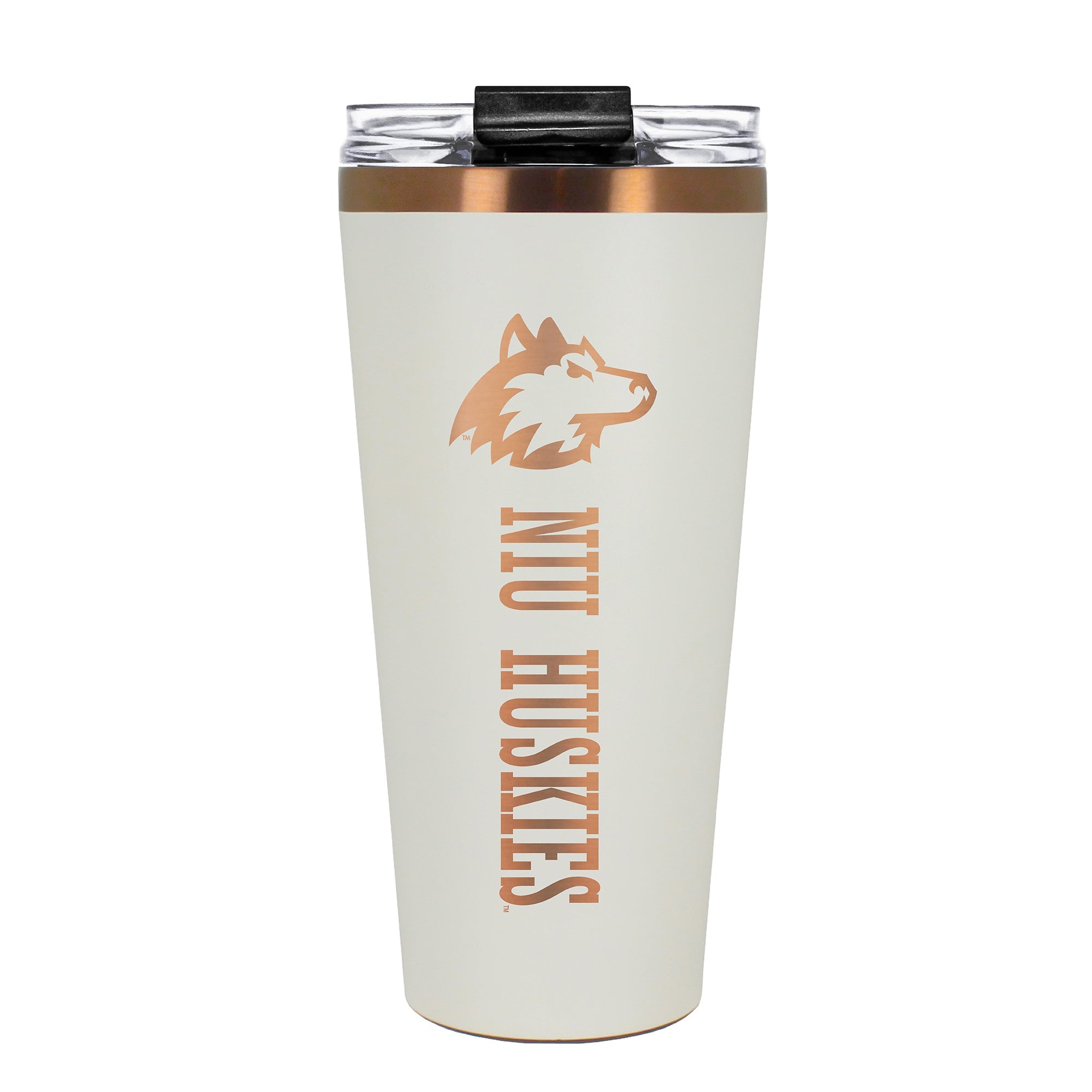 The 30 oz. BIG SLIM tumbler is made of high quality vacuum insulated stainless steel featuring premium copper undertones with a durable powder coated cream outer finish and laser etched team graphics. Includes a clear push down spill resistant lid and straw.