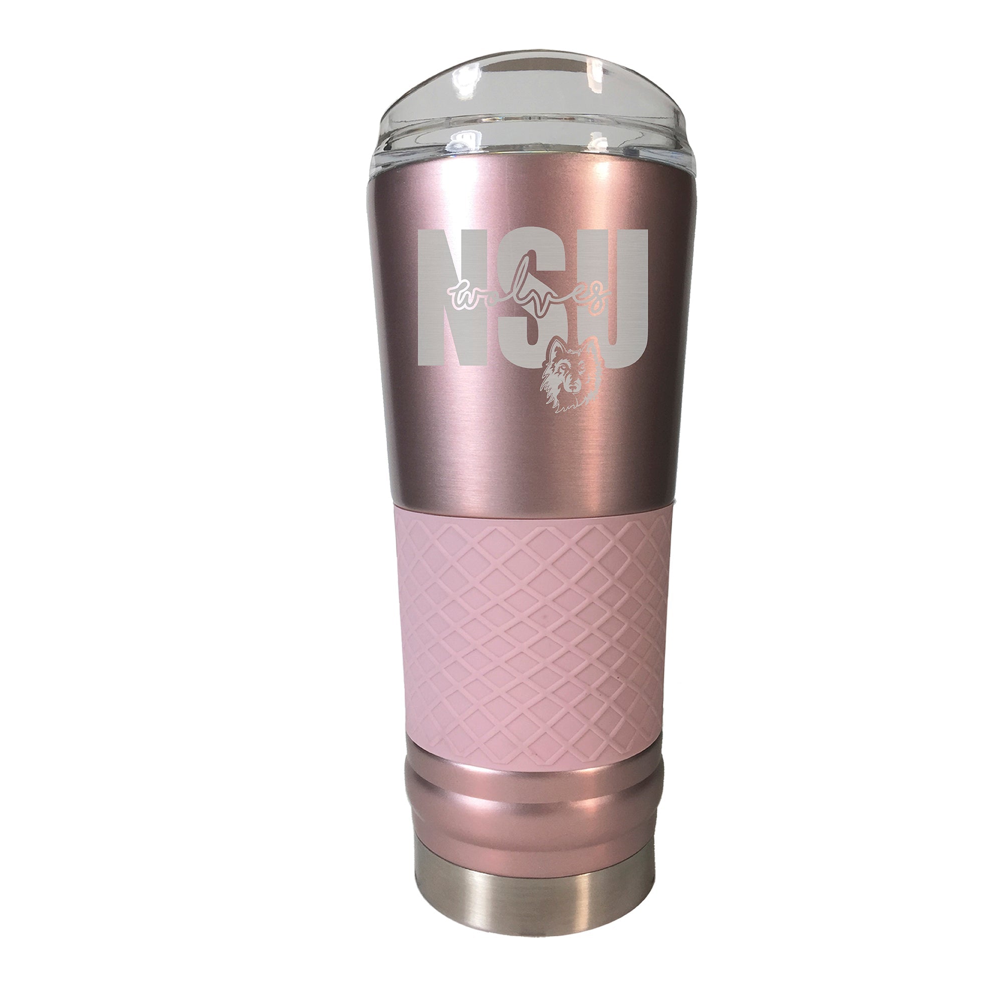 The 24 oz. Rose Gold DRAFT Tumbler is vacuum insulated and made of high quality stainless steel. It features laser etched team graphics and a silicone grip.