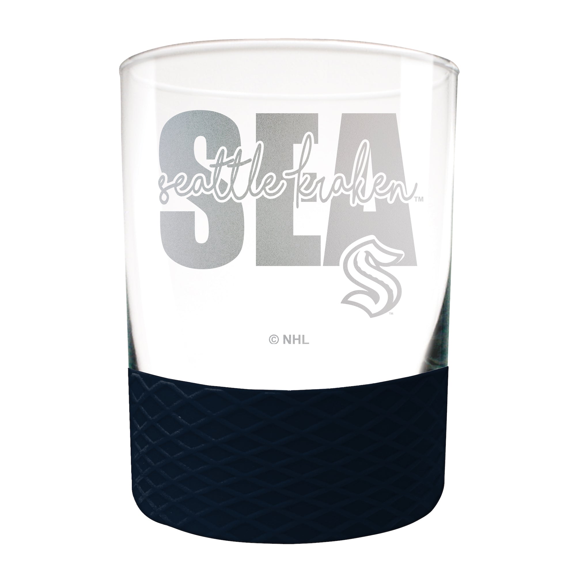 This 14 oz COMMISSIONER rocks glass is perfect for enjoying any beverage over ice. The glass is decorated with laser etched team graphics and team color coordinated silicone base