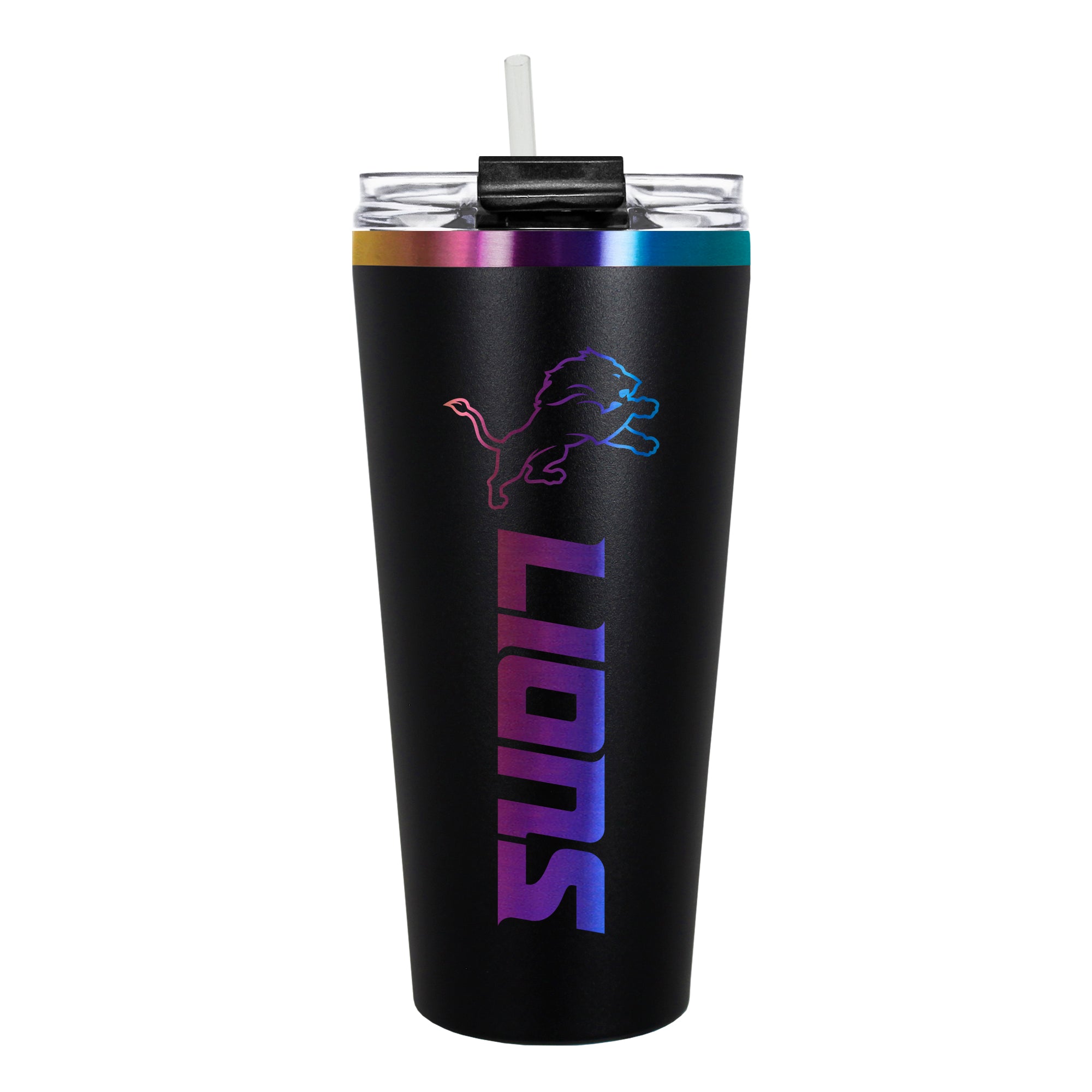 The 32 oz. BIG SLIM tumbler is made of high quality vacuum insulated stainless steel featuring premium multi-colorful radiance undertones with a durable powder coated black outer finish and laser etched team graphics. Includes a clear push down spill resistant lid and straw.