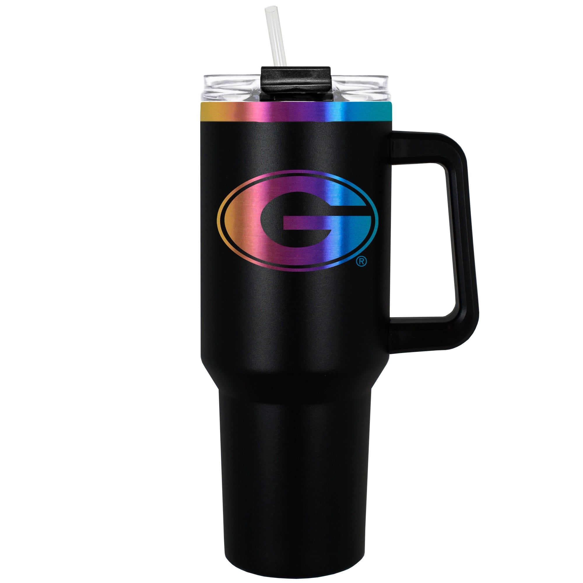 This 40 oz. COLOSSUS travel mug is made of high quality vacuum insulated stainless steel. It features premium multi-colorful radiance undertones with durable powder coated black outer finish and laser etched team graphics.