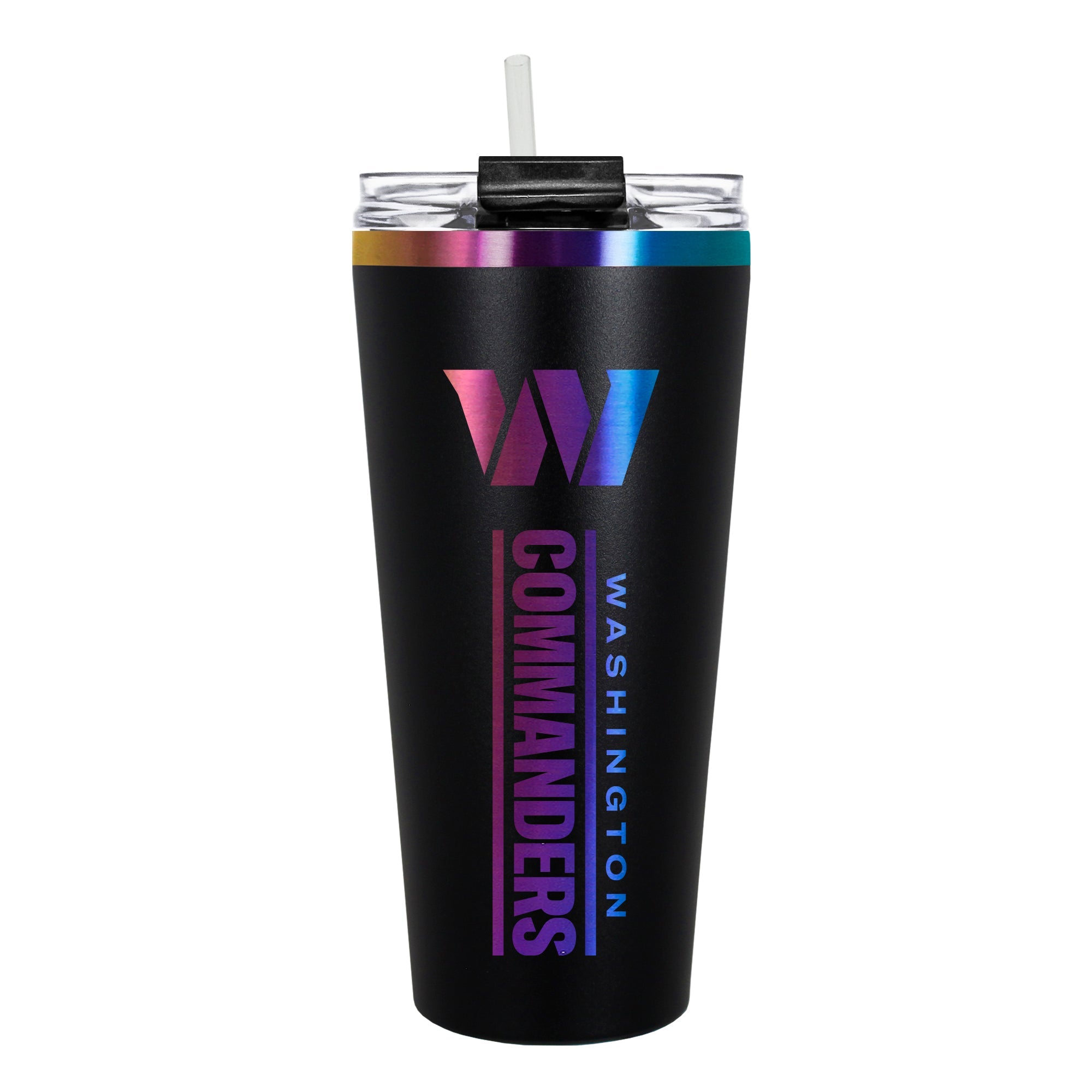 The 32 oz. BIG SLIM tumbler is made of high quality vacuum insulated stainless steel featuring premium multi-colorful radiance undertones with a durable powder coated black outer finish and laser etched team graphics. Includes a clear push down spill resistant lid and straw.