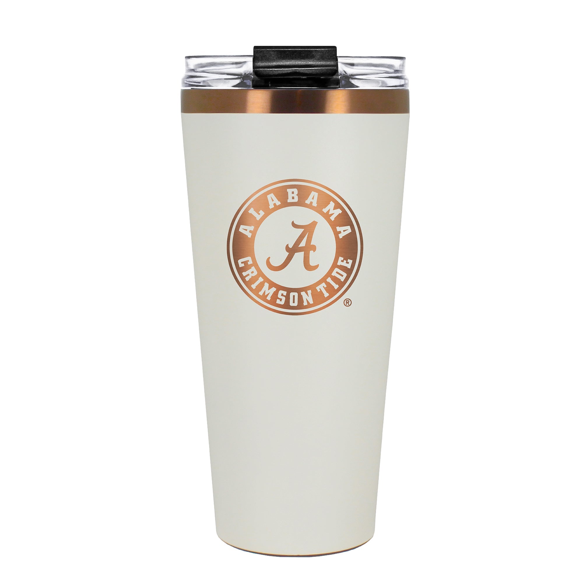 The 32 oz. BIG SLIM tumbler is made of high quality vacuum insulated stainless steel featuring premium copper undertones with a durable powder coated cream outer finish and laser etched team graphics. Includes a clear push down spill resistant lid and straw.