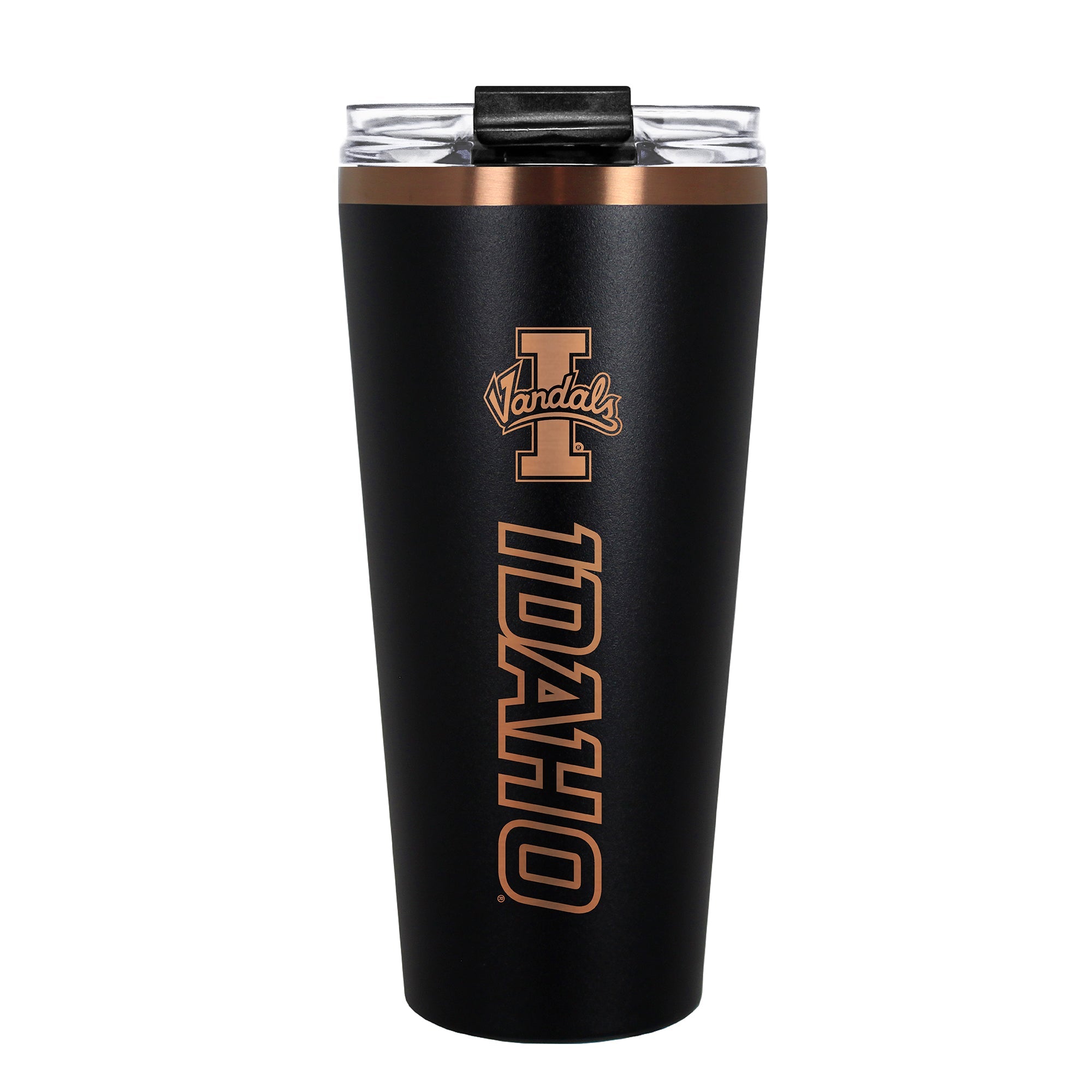 The 30 oz. BIG SLIM tumbler is made of high quality vacuum insulated stainless steel featuring premium copper undertones with a durable powder coated black outer finish and laser etched team graphics. Includes a clear push down spill resistant lid and straw.