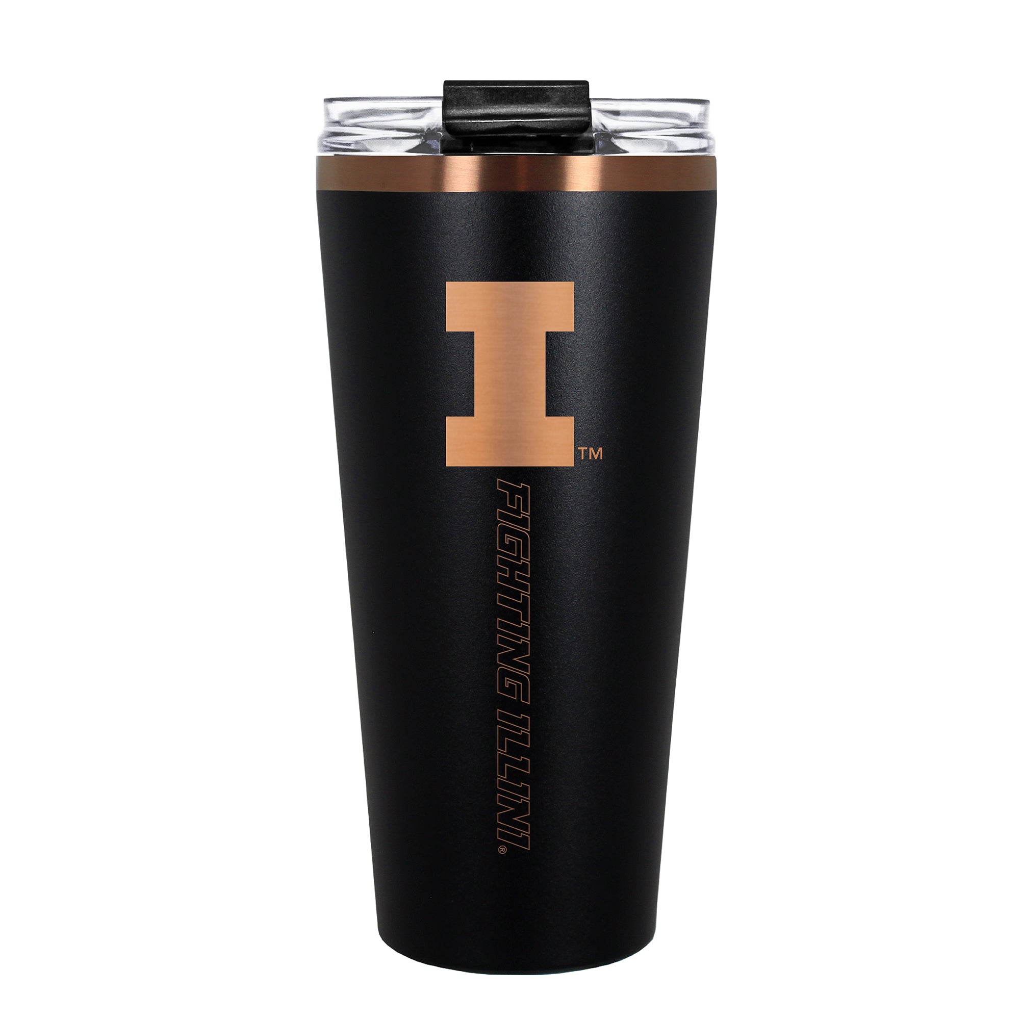 The 30 oz. BIG SLIM tumbler is made of high quality vacuum insulated stainless steel featuring premium copper undertones with a durable powder coated black outer finish and laser etched team graphics. Includes a clear push down spill resistant lid and straw.