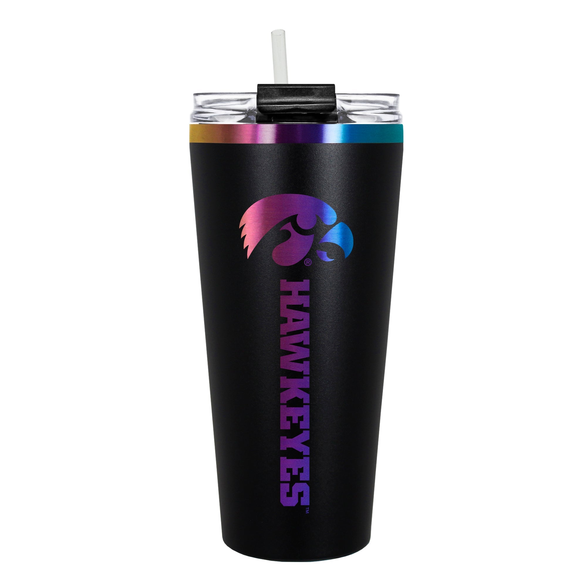 The 32 oz. BIG SLIM tumbler is made of high quality vacuum insulated stainless steel featuring premium multi-colorful radiance undertones with a durable powder coated black outer finish and laser etched team graphics. Includes a clear push down spill resistant lid and straw.