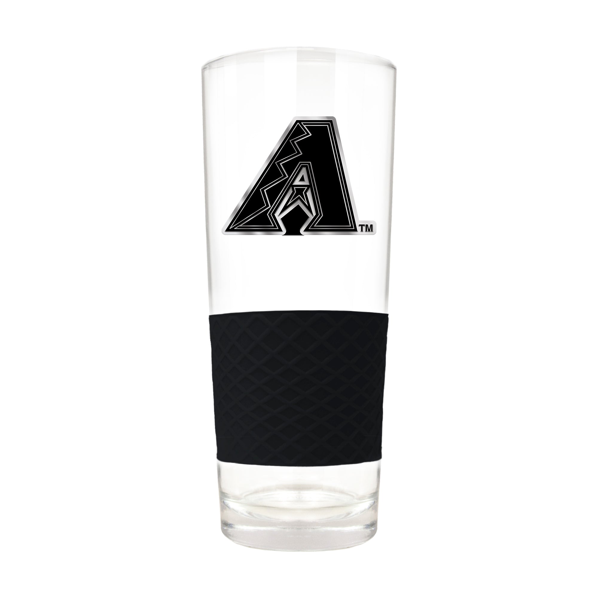 This 20 oz pint glass is decorated with a high-quality metal team logo and features a black silicone grip.