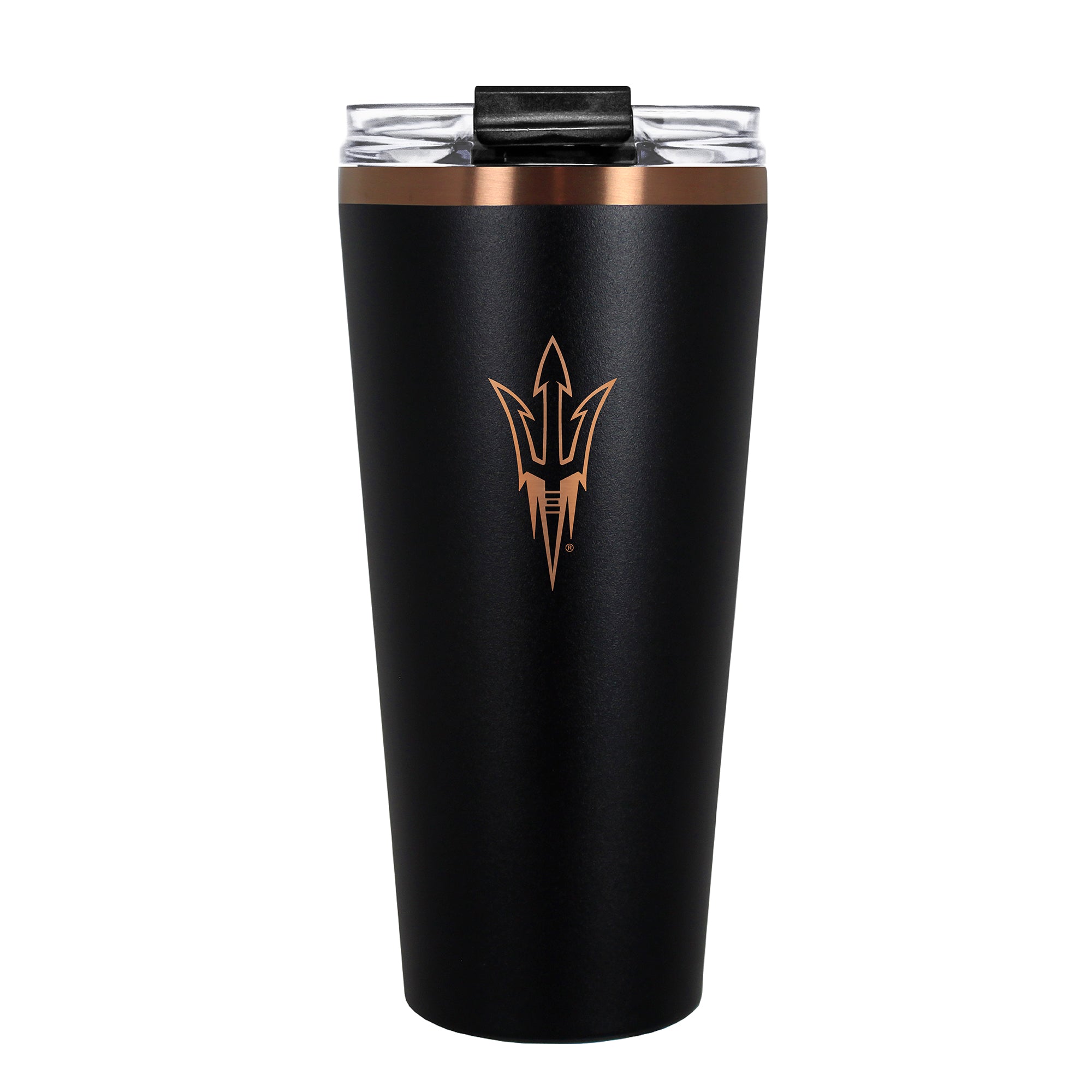 The 30 oz. BIG SLIM tumbler is made of high quality vacuum insulated stainless steel featuring premium copper undertones with a durable powder coated black outer finish and laser etched team graphics. Includes a clear push down spill resistant lid and straw.