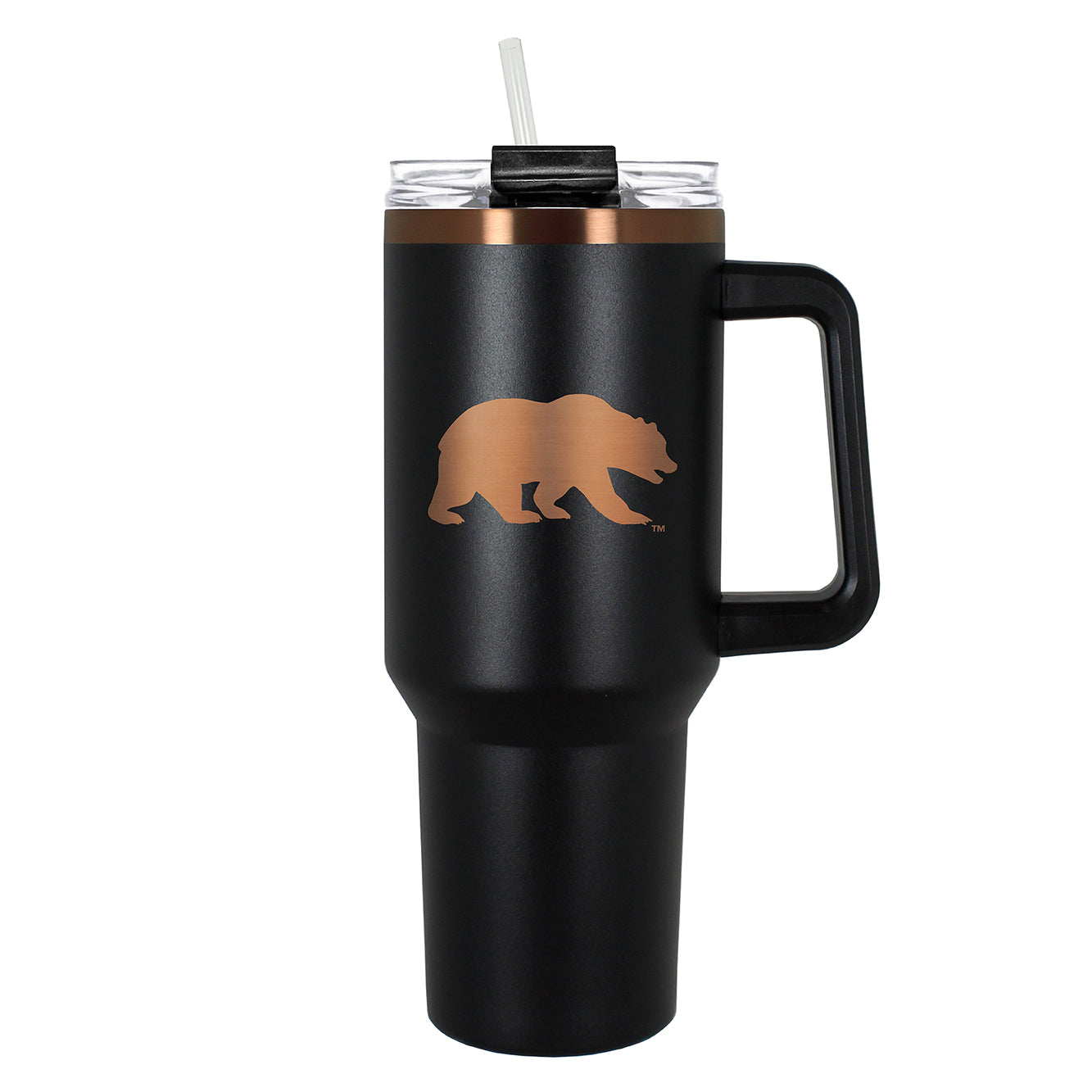 This 40 oz. COLOSSUS travel mug is made of high quality vacuum insulated stainless steel. It features premium copper undertones with durable powder coated black outer finish and laser etched team graphics.