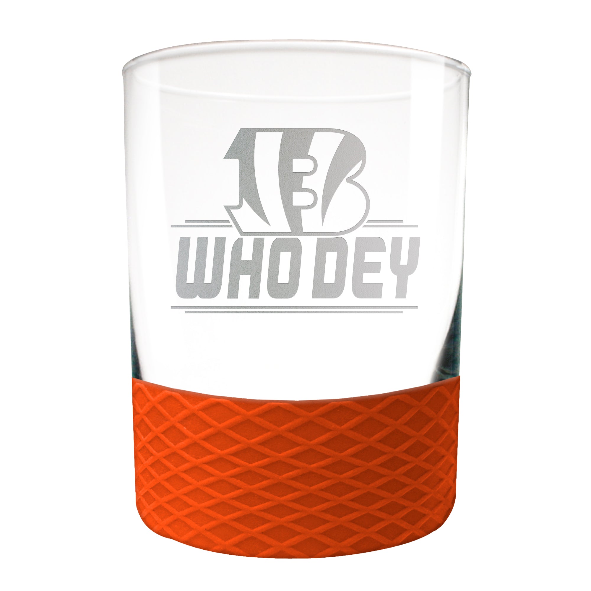This 14 oz COMMISSIONER rocks glass is perfect for enjoying any beverage over ice. The glass is decorated with laser etched team graphics and team color coordinated silicone base