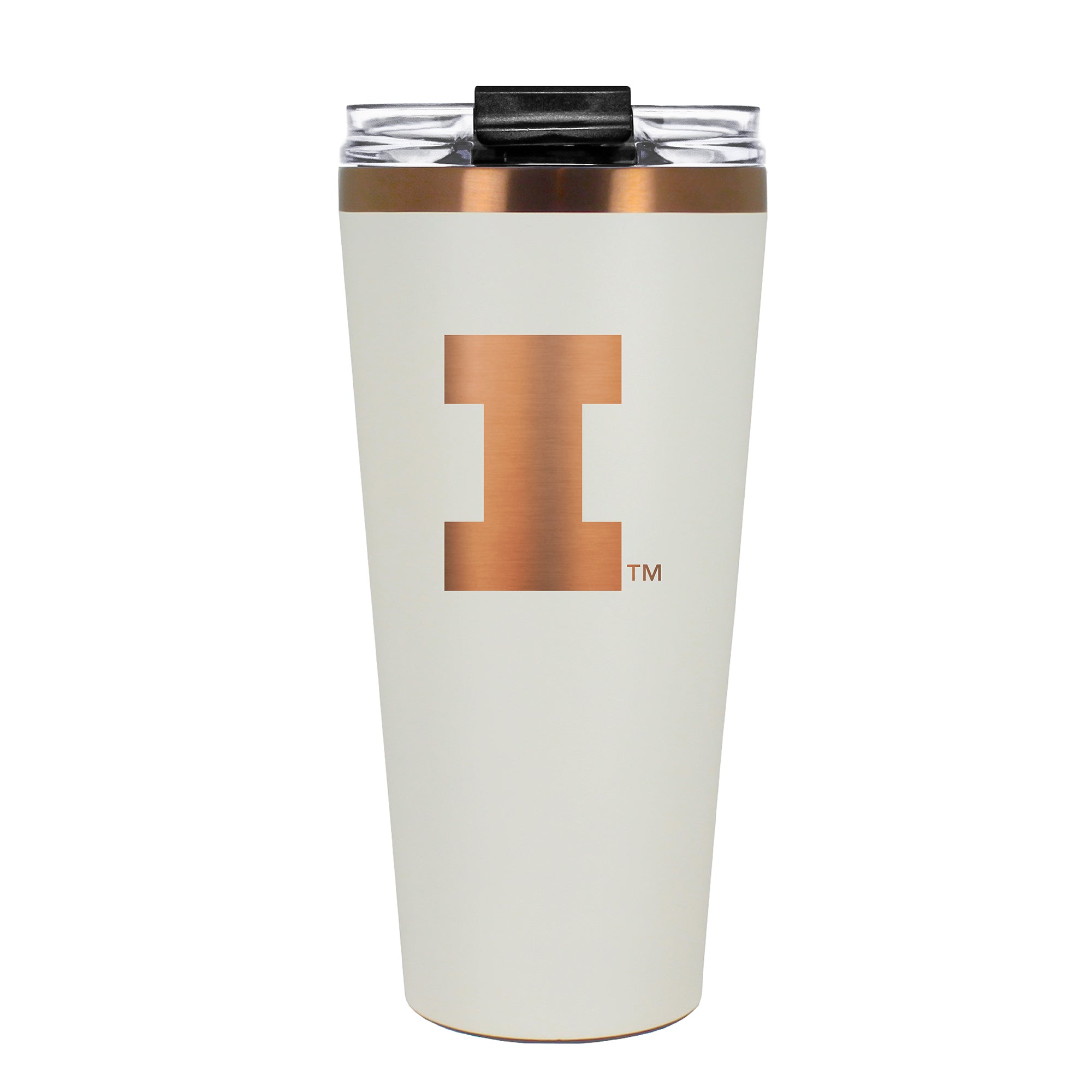 The 30 oz. BIG SLIM tumbler is made of high quality vacuum insulated stainless steel featuring premium copper undertones with a durable powder coated cream outer finish and laser etched team graphics. Includes a clear push down spill resistant lid and straw.