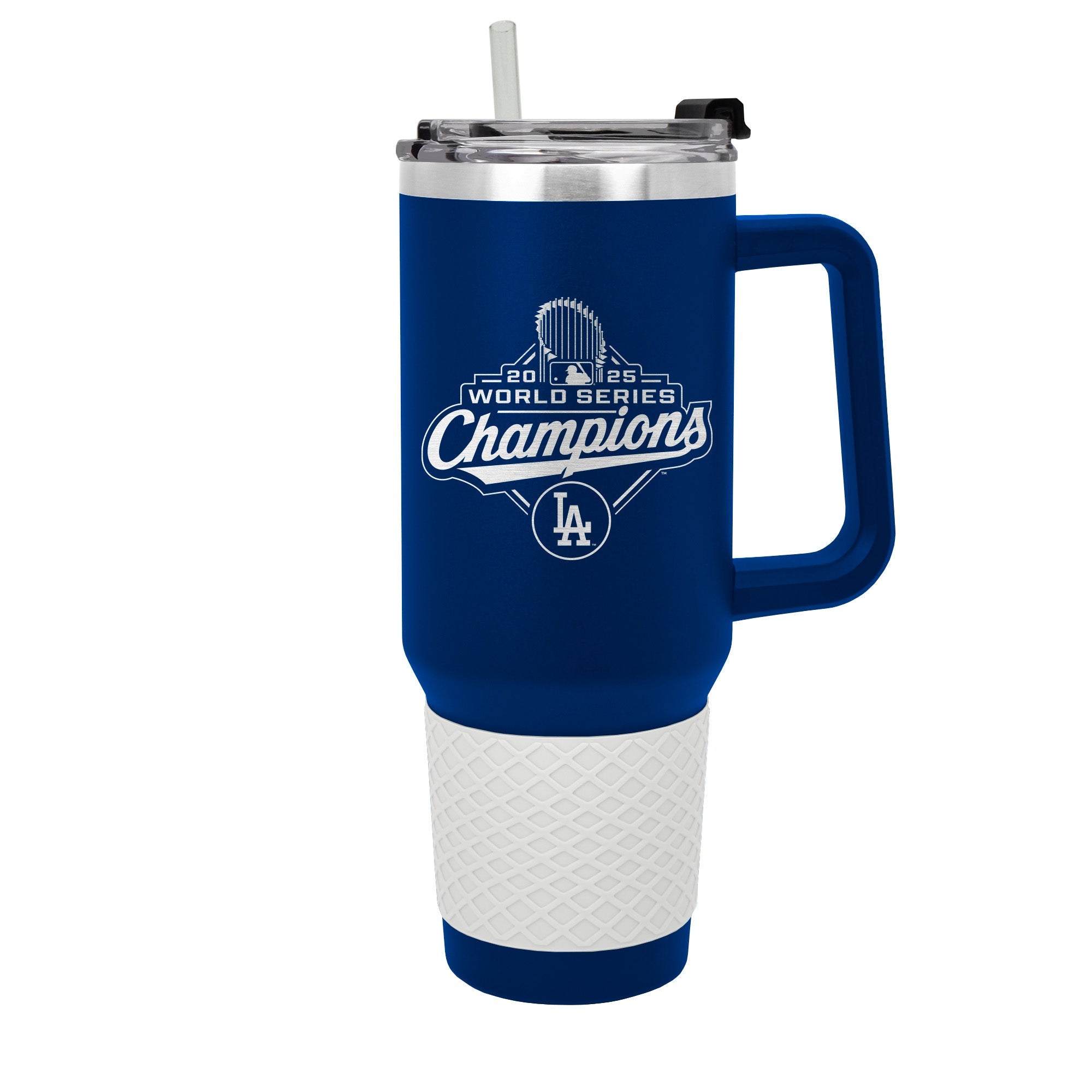 The 40 oz. COLOSSUS travel mug is made of high quality vacuum insulated stainless steel and comes in team colors with a coordinating color silicone grip. It features a high quality laser etched officially licensed World Series Championship graphics. Includes a push down lid and clear drinking straw.