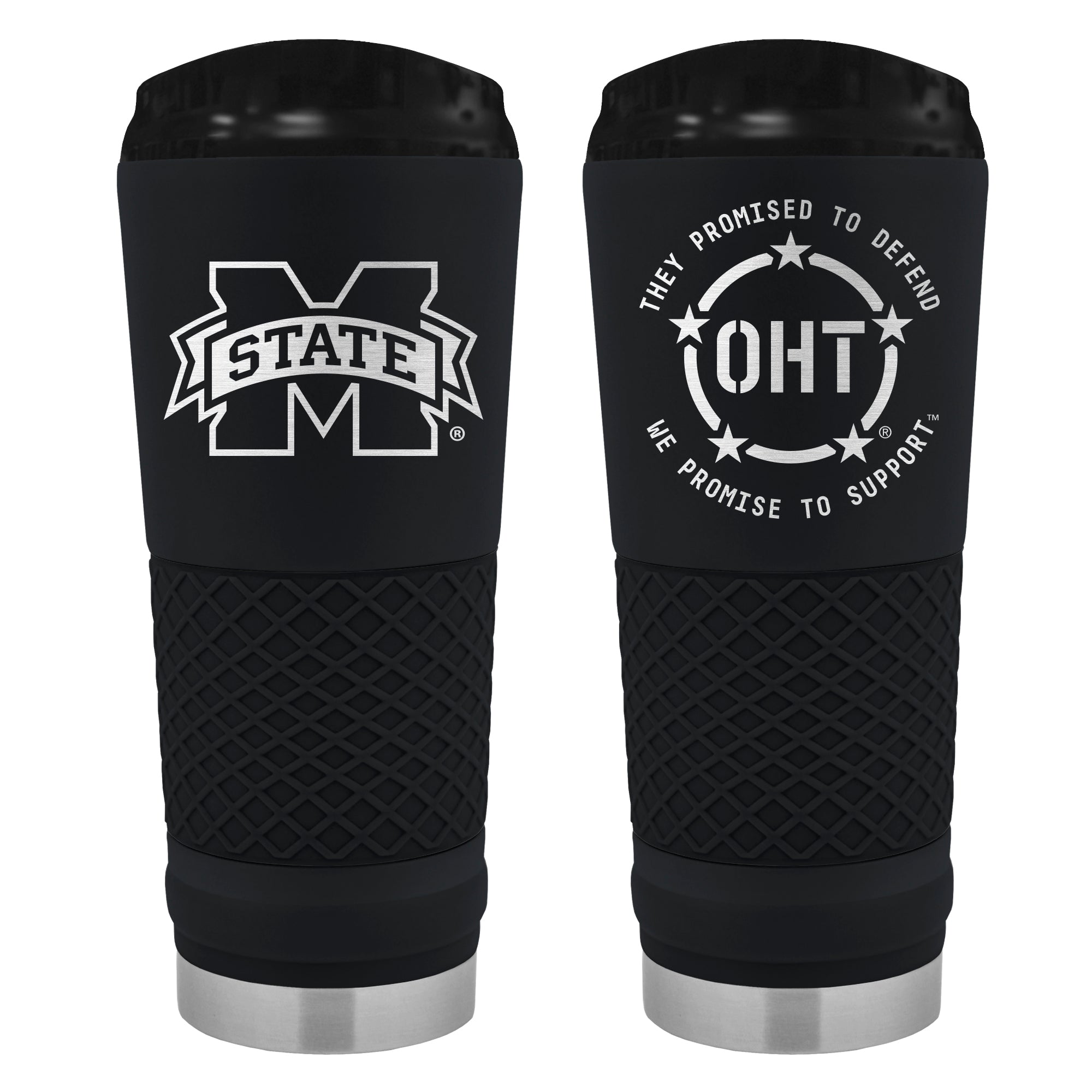 This 24 oz vacuum insulated travel tumbler is made of high quality black powder coated stainless steel. It features a laser engraved logo and is available in a black silicone grip color. Available in select colleges in conjuction with Operations Hat Trick.