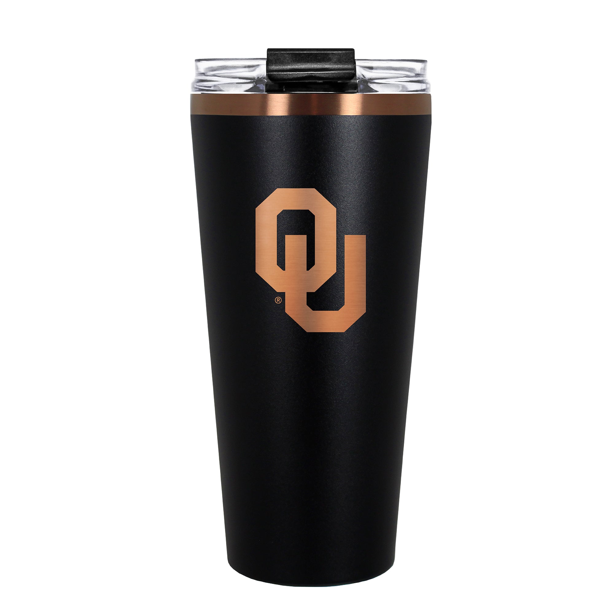 The 30 oz. BIG SLIM tumbler is made of high quality vacuum insulated stainless steel featuring premium copper undertones with a durable powder coated black outer finish and laser etched team graphics. Includes a clear push down spill resistant lid and straw.