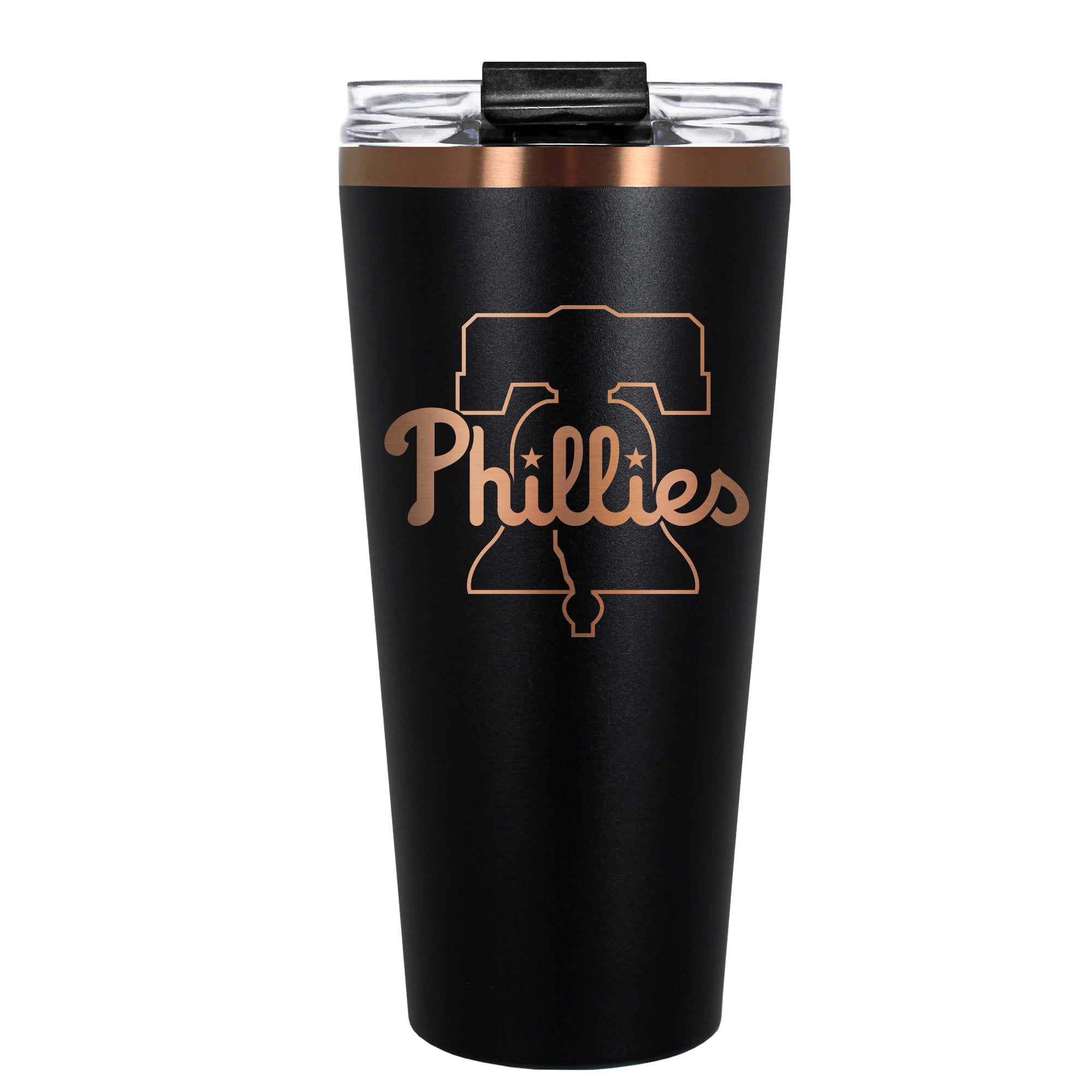 The 30 oz. BIG SLIM tumbler is made of high quality vacuum insulated stainless steel featuring premium copper undertones with a durable powder coated black outer finish and laser etched team graphics. Includes a clear push down spill resistant lid and straw.