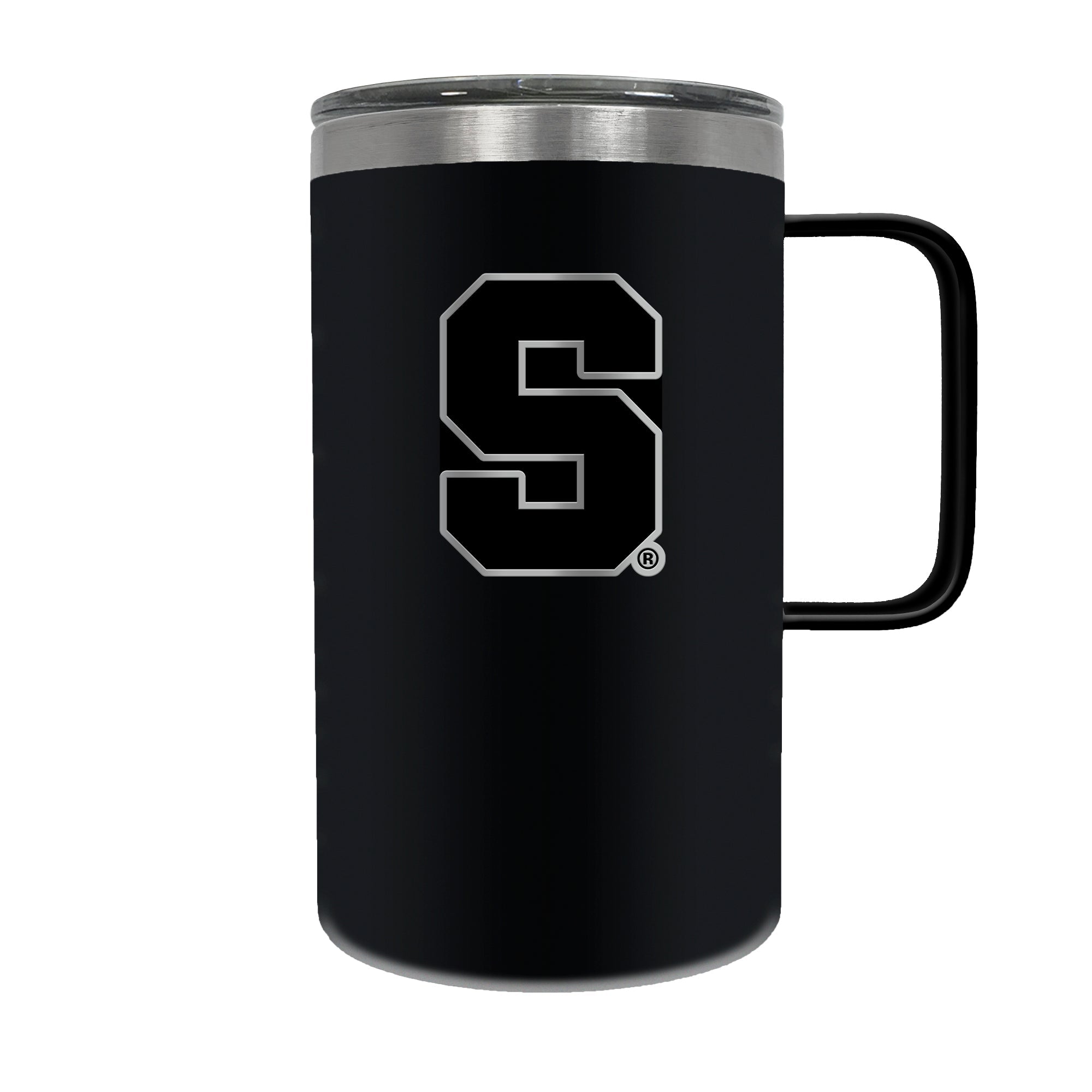 The Hustle is a 18oz vacuum insulated travel mug with large handle. Includes spill resistant lid and features a 3-dimensional handcrafted emblem.